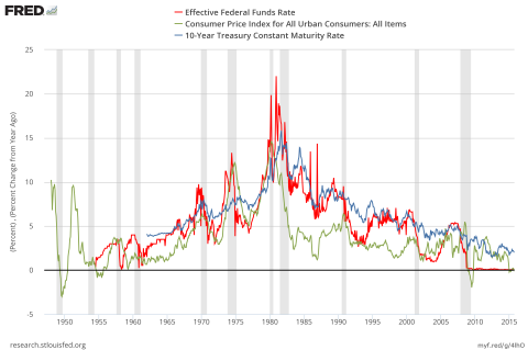 The typical tool for our central bank (The Fed) is to raise rates when the economy and inflation is overheating and lower rates when entering a recession. The rate used is a very short-term rate (Fed Funds Rate – think 1 month T-Bills) but the effect feeds through the financial system impacting all rates of different maturities, though not in tandem. The graph below shows the Fed Funds rate, 10-year treasury rate and inflation since 1950. The grey bars represent recessions.