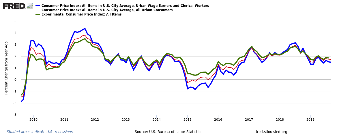 Note the inflation index used for Social Security is the non-seasonally adjusted index for wage earners (CPI-W), not the more common seasonally adjusted index for all urban consumers (CPI-U) used in regular inflation reports reported in the media. There is also an experimental inflation index called CPI-E which captures the common basket of goods and services for those age 62+. There are years when these different indices can diverge significantly. Last year the difference was less than 0.10%; this year the CPI-E is about 0.30% higher. The graph below shows these indices over the past ten years (Note: no shaded area for recession!). The common CPI inflation number in the news every month is the red line.