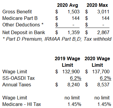 The 2020 inflation adjustments for Social Security benefits and maximum salary subject to OASDI payroll taxes have been finalized. Benefits will increase 1.6% before Medicare premiums are deducted. For the average benefit this is an increase of $24. The maximum wage limit subject to the 6.2% portion of SS taxes will rise 3.6% to $137,700. Medicare premiums for 2020 have not been officially announced but the spring Trustee report showed an expected increase of $8.80 per month. Here is the impact in dollar terms for an average and maximum monthly benefit.