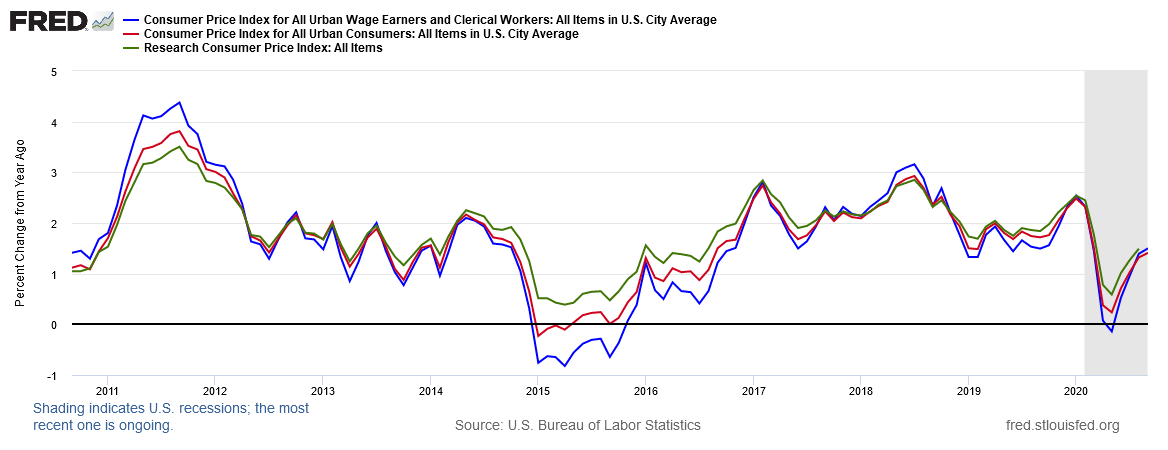 Note the inflation index used for Social Security is the non-seasonally adjusted index for wage earners (CPI-W), not the more common seasonally adjusted index for all urban consumers (CPI-U) reported in the media.  There is also a research price index called R-CPI-E which captures the common basket of goods and services for those age 62+.  There are years when these indices can diverge significantly, mostly in years when headline inflation deviates from the long-run average.  Last September the R-CPI-E was 0.35% higher; in August 2020 it was less than 0.10% higher (Sep reading not out yet).  The graph below shows these indices over the past ten years (Note: shaded area is for recession).  The common CPI inflation number in the news every month is the red line.