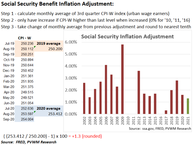 Each fall after the release of September CPI data the inflation adjustment for Social Security benefits is finalized.  Around that time the maximum salary subject to Social Security payroll taxes is also determined (based on a different index).  The September CPI-W data point has been released and SS benefits will increase 1.3% in 2021.  For those paying into SS, the maximum wage base subject to 6.2% payroll tax will go up 3.7% to $142,800.