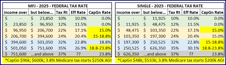 OBBBA Impact – some features that begin in ’25 (see recent blog post) have income limits where begin to lose the tax benefit. Be aware what capital gains may do to some of those benefits if applicable.