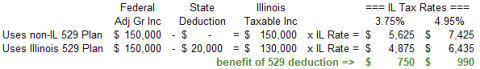 So yes, your tax bill will be higher in Illinois. But if you are contributing to an IL 529 plan, it will be softened by $240. And if you are contributing to a non-IL plan, I encourage you to revisit the IL 529 College Savings Plans options. An extra $990 goes a long way in making up minor difference in fees or investment choices for out-of-state plans.