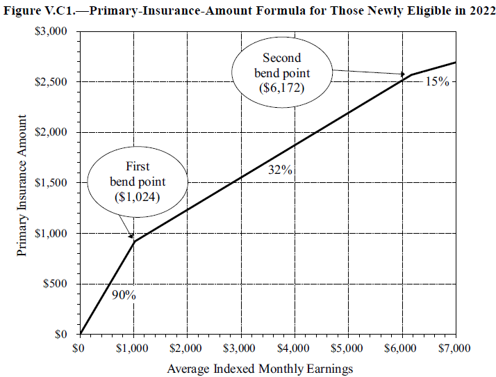- Social Security uses “bend points” to calculate the benefit received. Everyone pays the same 6.2% FICA tax on income but the amount of benefit paid is based on 90% of first $1,024 in monthly earnings, then 32% on income between $1,024 - $6,172, and finally 15% above. This results in lower income workers receiving a much higher % of their income as a benefit. Keeping with the “social” part of the program and lifting individuals out of poverty makes sense. But it should be recognized the benefit calculation is already quite progressive (see graph below).