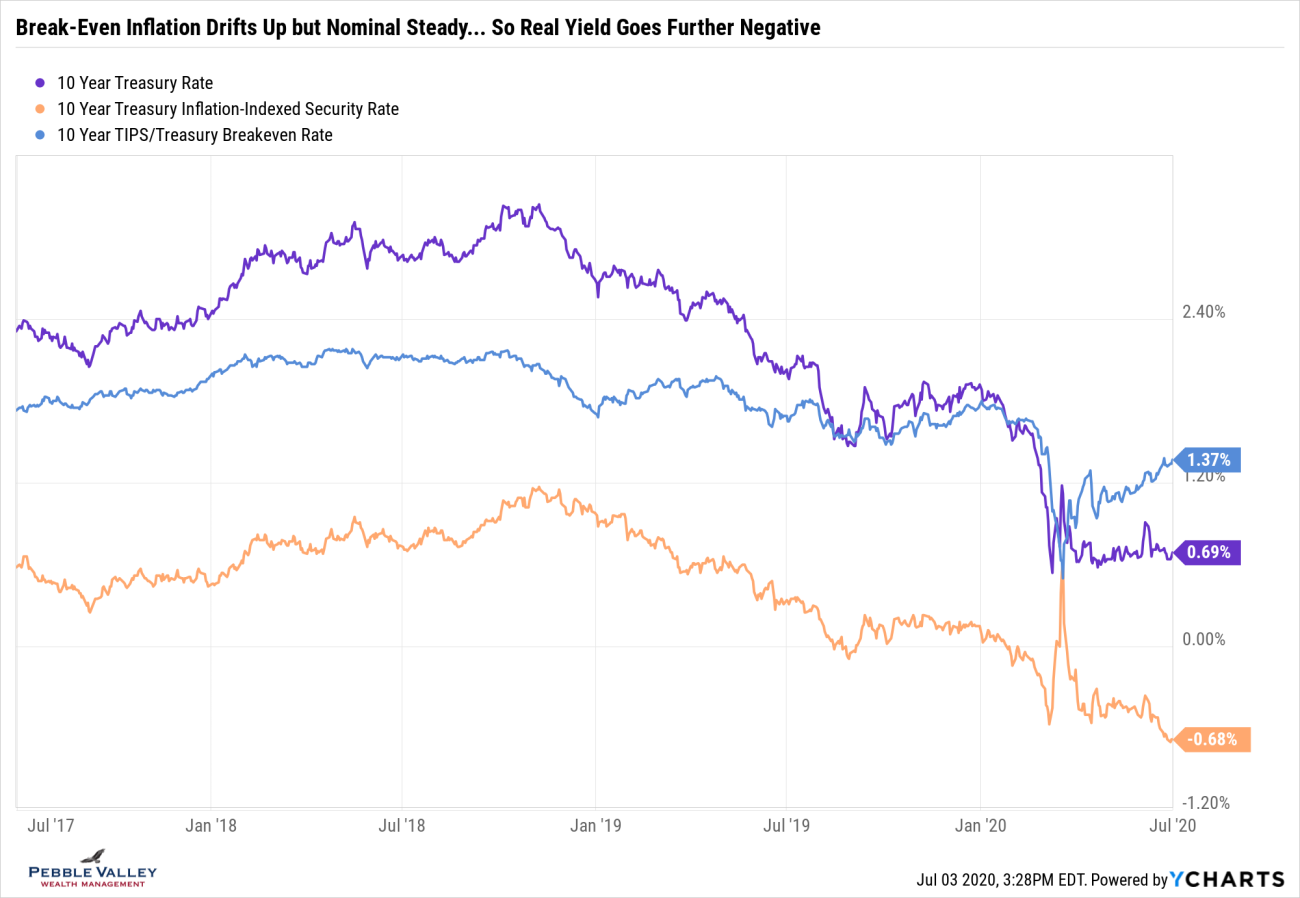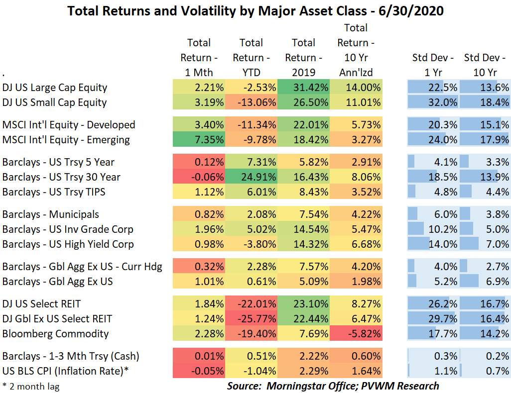 Interest rates remain very low. The Fed reiterated their intent to keeping rates near zero through 2020 based on the “dot plot" (see pg 3 in this link) from the FOMC meeting June 10th. That’s a long time. One rate that has been drifting up this month is the break-even inflation rate implied from the TIPS market. This is also seen in the slight drift up of long-term rates that are most vulnerable to inflation … down the road. Note the only two negative values in the last month column below is 30-Yr treasury return and inflation.