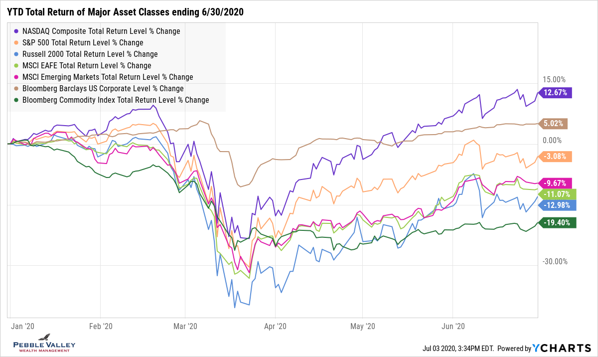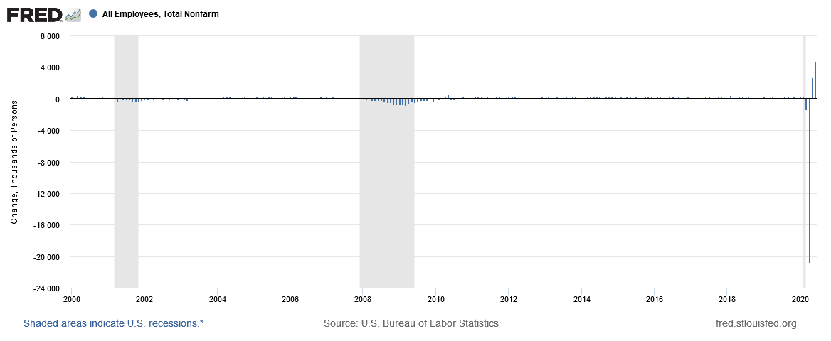 The month of June got off to a strong start on the back of a surprising jobs report that showed a faster than expected resumption of business activity. That enthusiasm was dampened during the month by concerns of whether that pace can continue and rising trade tensions with China. The June jobs report released July 2 showed the re-hiring pace continued, with much of the job increases coming from “leisure and hospitality” (see pg 3 of this link). Some of these establishments may have to pull back again in some regions but expected to be a slowing of the acceleration, not a deceleration. Note a few things on the monthly change in jobs and unemployment rate over the past 20 years.