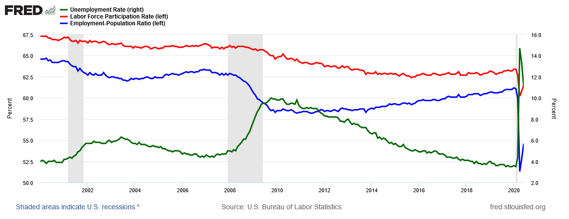 - Yes the unemployment rate was ugly, but not as high as people feared and a quick turn after one month - popping from 4.4% in March to 14.7% in April then back to 11.1% by June
