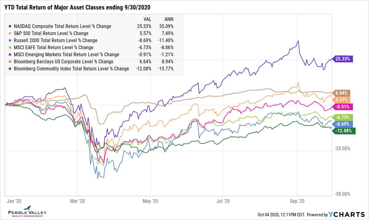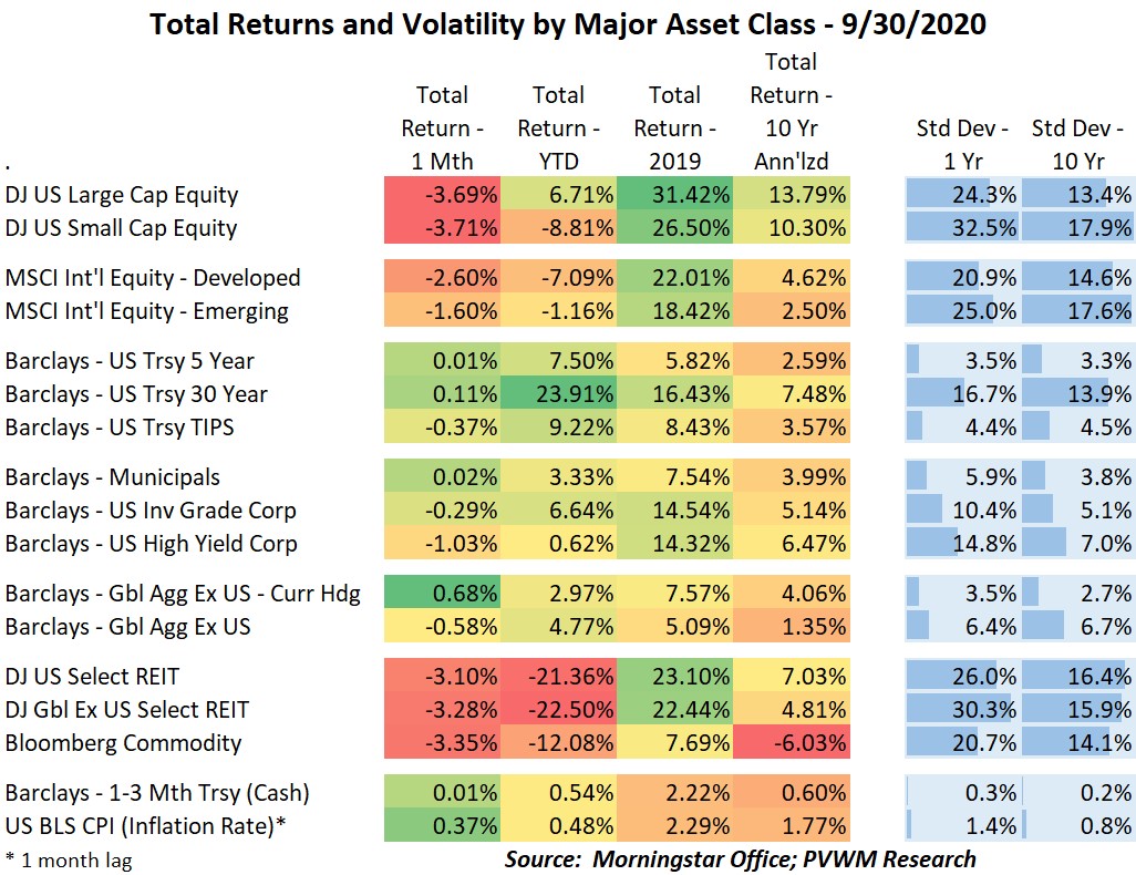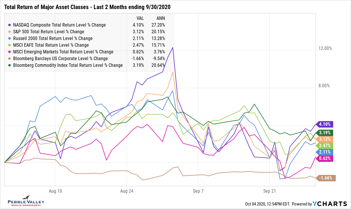 There was also a noticeable positive shift toward end of month after the bipartisan Problem Solvers Caucus proposed a $1.52 trillion (with a “t”) framework for the relief/stimulus bill the previous week.  I follow the usual YTD graph of major asset classes with a two-month view to see this dynamic.  Also note the negative print for this time period from the corporate index.  Treasury rates were flat during September after rising (prices falling) in August.  These rates bear watching, with potential for further rising if the current relief bill is passed, results of the election which may impact future spending plans, and the Fed’s intent to let inflation run above 2% for some time (see later).