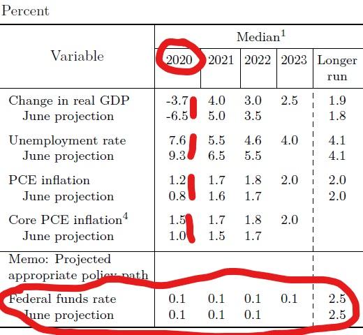 Speaking of rates, the FOMC meeting that concluded 9/16 included an update to economic projections which were more constructive for 2020 than the June projection.  There was also reinforcement of the intent to keep short-term rates near 0% for a long time (see table below).  The Fed also clarified its 2% inflation target framework.  “With inflation running persistently below this longer run goal, the Committee will aim to achieve inflation moderately above 2 percent for some time so that inflation averages 2 percent over time and longer-term inflation expectations remain well anchored at 2 percent.”  And while the Fed will continue to purchase bonds at the current pace, there was no mention of a rate cap on longer bonds.  This may lead to higher rates for longer maturities while short-term rates are anchored near 0%.