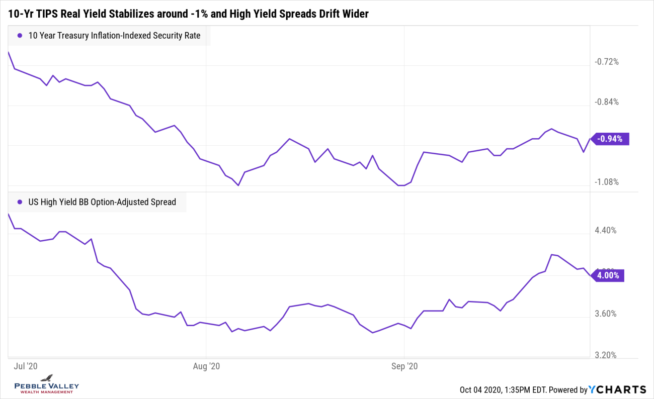 What else is on my mind?  10-year real yields from the TIPS market remains around -1% but has not fallen beyond that the last couple months and high-yield spreads widened in September along with the equity pullback, but not a major move.  Some market strategists point to the negative real yield as a driver to higher equity valuations of longer-term growth stocks.