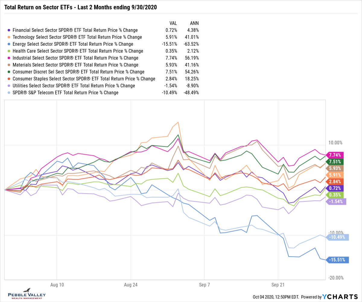 On the sector front, using the same two-month view for focus, energy took another leg down in September as global growth and a stronger dollar provided headwinds.  Financials were replaced by utilities and telecom as the other negative sectors.  Most of that damage was done in August with higher rates.