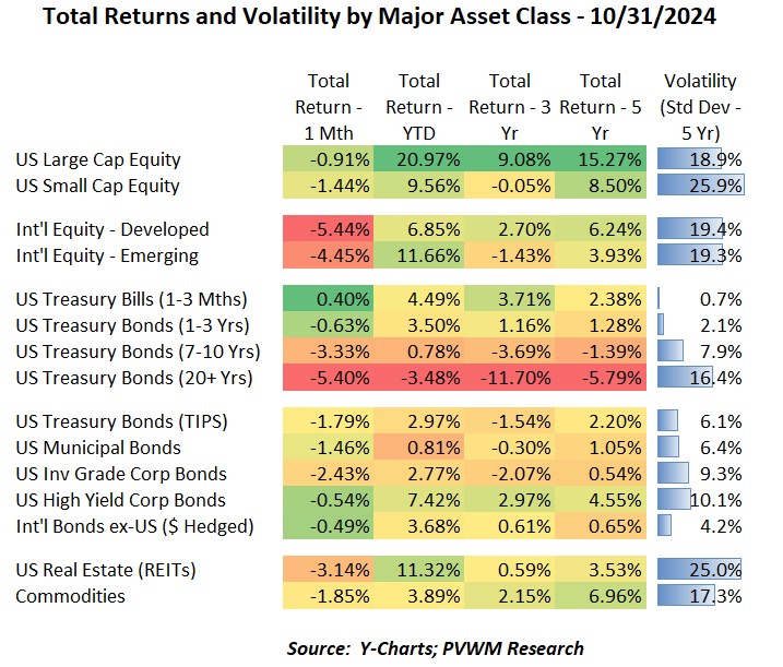 In the US equites market, the start of the month was positive with both Large and Small Caps hitting YTD highs. Even REITs recovered from a slow start and almost hit their YTD high despite rising rates. However, international equities were on a downtrend all month, though Emerging Markets were coming off a recent relative spike. Interest rates moved higher (bond prices down) pushing YTD returns for long-dated treasuries back into negative territory. Even 10-year treasuries had a -3.3% loss for the month, getting bond investors’ attention following the mid-September Fed rate cut. Looking at the table above, the only positive monthly return is short-dated Treasury Bills as duration did its damage on longer-dated bonds. US equities faired noticeably better than international though YTD those asset classes have very high returns with a longer-term view. The lower monthly returns for international equities is partially driven by higher rates – or more accurately fewer expected rate cuts – which strengthened the US dollar and impacts returns when converting back to US terms.