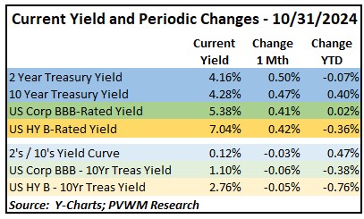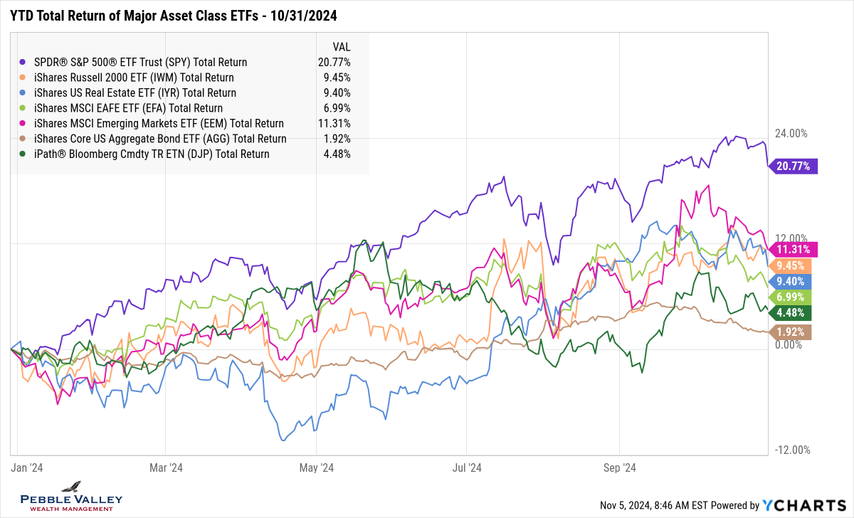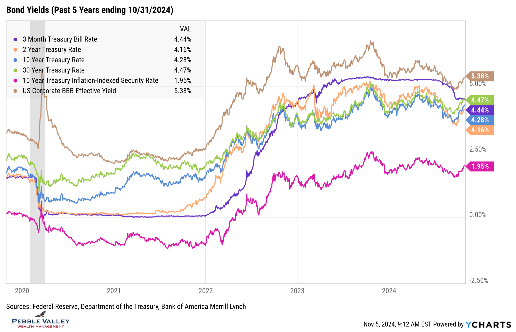 The graph below shows YTD total returns of major asset class ETFs. US Large Caps (captured by SPY, purple line) has owned the top throughout most of 2024. The sharp dip the last couple days was primarily driven by some tech companies announcing disappointing revenue outlooks during earnings calls. Sectors within US Large Caps that outperformed were Financials, Communication Services and Energy. As a reminder, Communications not only includes phone carriers but also tech heavy Meta and Google. Emerging Markets (ticker EEM – magenta line) had a strong run leading into October but couldn’t hold the momentum as expectations of stimulus out of China weren’t as great. However, all equities returns shown have YTD returns of 6.99% or higher, so let’s keep any pullbacks in context. The US Aggregate bond index (ticker AGG – brown line) continued to drift lower as rates rose substantially in October. Let’s go there now.
