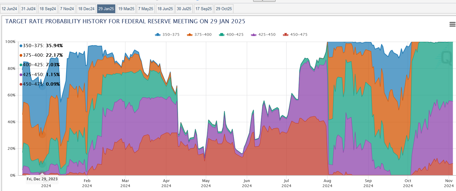 The next FOMC meeting concludes this Thursday November 7 (day later than normal due to not starting the two-day meeting on election day). The market is pricing in an overwhelmingly high probability the Fed will cut rates by 0.25%. More interesting to me is what is priced in over the next three meetings. Recall the current Fed Funds rate is 4.75 – 5.00% after the 0.50% cut in September. The graph below shows the implied probability of rate cuts after three more Fed meetings concluding on January 29, 2025. At the beginning of October, the market was pricing in at least four and possibly five 0.25% rate cuts. That is now backed off to likely three more cuts – one at each meeting. With recent economic data showing strong GDP growth, lingering inflation and a solid jobs market, even three cuts over three meetings could be too high. (graph sourced from CME Fedwatch).