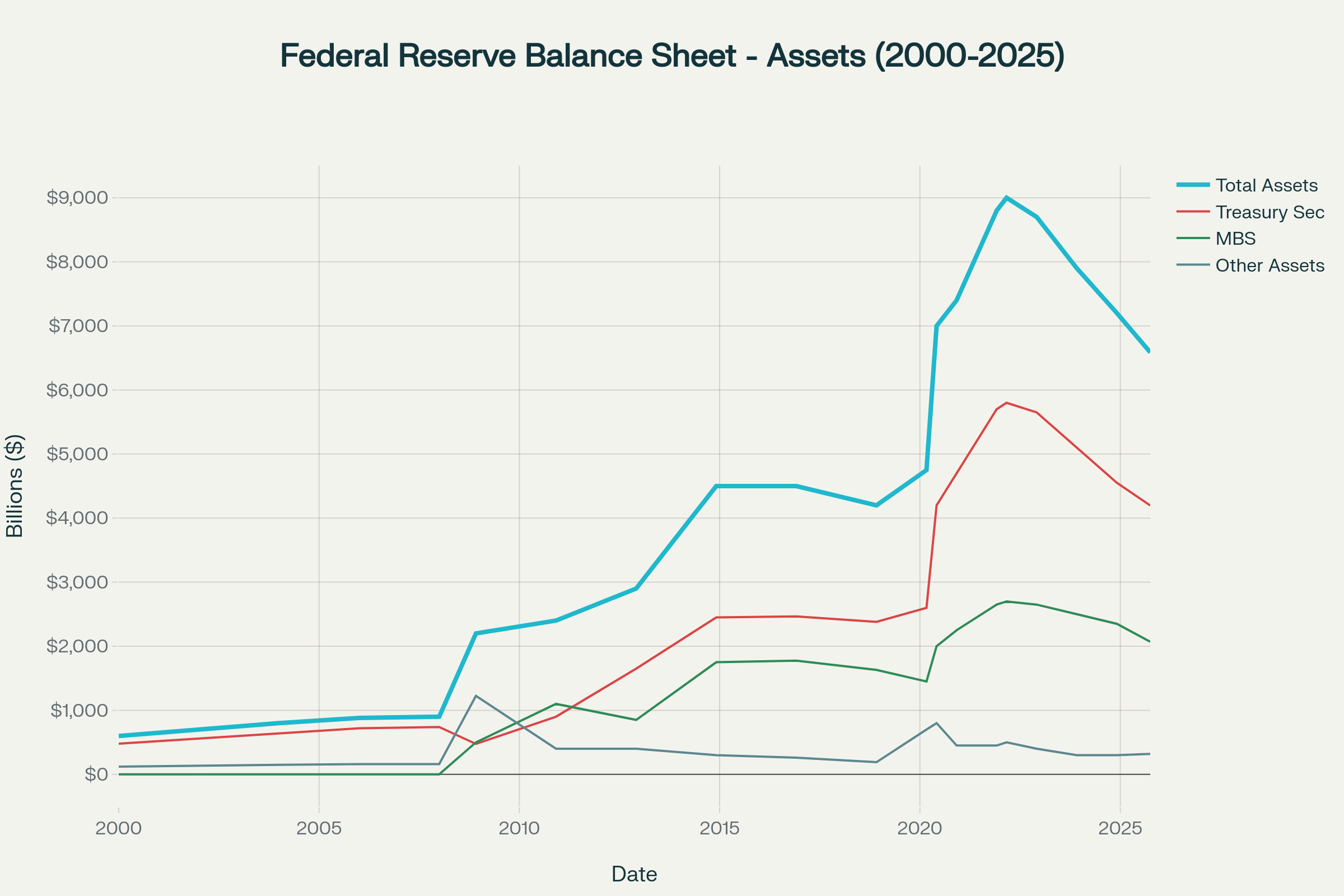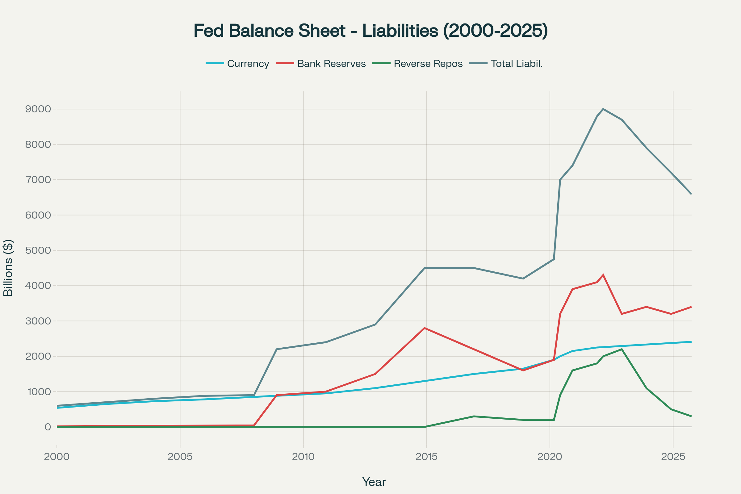 The latest FOMC meeting concluded on October 29th.  The Fed delivered the expected 0.25% rate cut. Before the meeting, an additional rate cut at the December meeting was fully priced in.  However, during the press conference, Fed Chair Powell stated “A further reduction in the policy rate at the December meeting is not a foregone conclusion—far from it, policy is not on a preset course.”  This along with two dissents – on voting member wanted 0.50% cut and other wanted no cut - caught the market by surprise and Fed Funds futures began pricing in a possible pause in December, with implied probability about 37% at end of October (Source:  CME Fedwatch).  Powell also reiterated the Fed’s inflation target remains at 2%.  That didn’t seem to get as much attention but it surprised me. The other Fed announcement had to do with stopping the runoff of Treasury and mortgage-backed securities starting December 1 (end of quantitative tightening or QT).  Rather than letting the cash go to the open market for participants to buy, the proceeds will be reinvested in T-Bills, which is seeing a huge demand from Stablecoins.  The Fed’s focus is to stop shrinking bank reserves to help move short-term funding rates lower.  The graphs below show the Fed’s Balance Sheet back to the year 2000 to present (any Conan fans?).  Bank reserves are a liability.  Because there is no equity on Fed’s Balance Sheet (adjustments with Treasury) the Assets = Liabilities, so if assets stop shrinking the liabilities will stop shrinking. Source:  Perplexity.ai PRO which used FRED data and intelligent query by user!