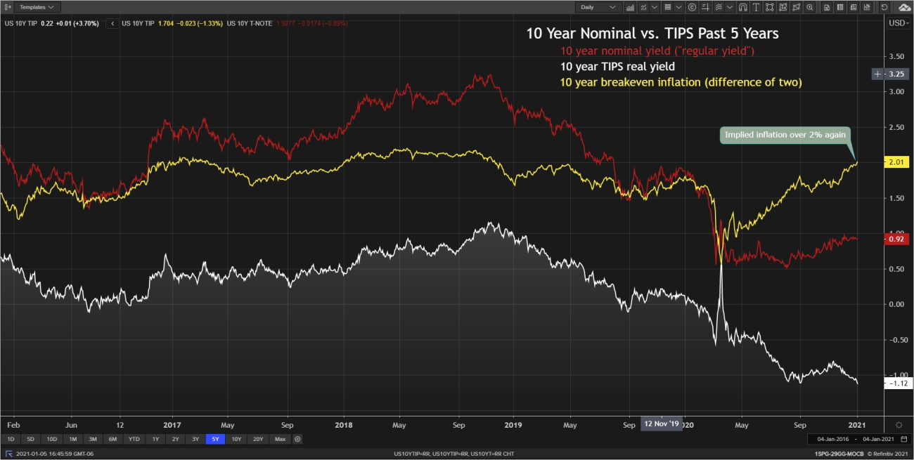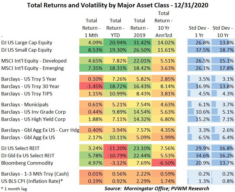Treasury rates remained relatively stable for nominal yields in December with a continued slow drift upward. But the market’s expectations for inflation on the back of the new stimulus bill is moving up faster than a slow drift, up over 2% early in 2021. This pushes the real yield of TIPS even more negative, going below -1.10%. Note for TIPS the principal amount is adjusted based on the growth of actual CPI to make up the difference in yield vs. the nominal bond. It will be interesting to see how long maturity nominal yields move near term. Probably a good time to brush up on your bond holdings’ duration.