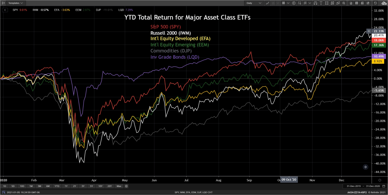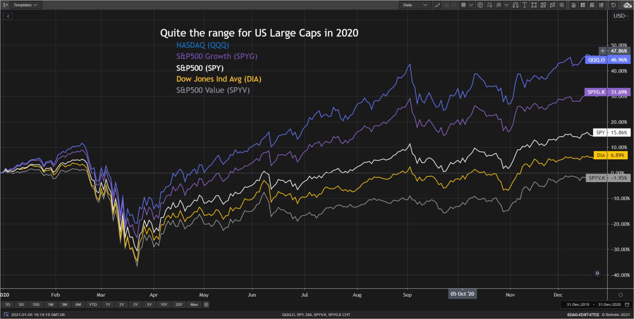 While reviewing year-end returns last week, I made a mental note to use three common equity indices – NASDAQ, S&P500 and Dow Jones Industrial Average – rather than my typical growth vs. value indices that readers may be less familiar with to capture the theme of dispersion in the markets. NASDAQ not only captures the growth theme but also the dominant technology sector. DJIA is comprised of more established companies and contains more than a few value stocks. The graph below captures this amazing spread in returns – again, all in a single asset class. I added the growth and value ETF returns for context.