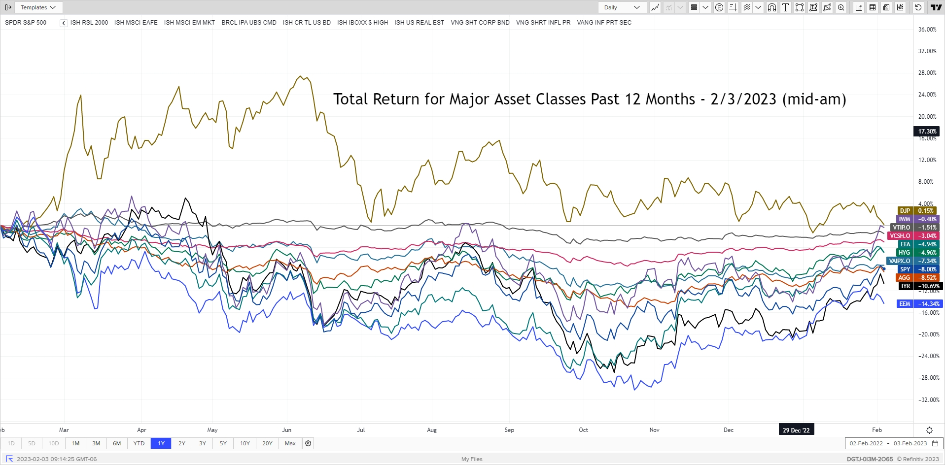 The market said “Let’s go!” for the first month of the year as it put 2022 in the rear-view mirror.  Glancing at the table above, the one-month returns are approximately in line with long-term full year returns, save for some bonds and commodities.  And this was before the February 1st FOMC meeting which added another 1-2% on top of these returns if we add a day.  One must remember there can be technical factors that drive price – buying back after tax-loss selling, beginning of year asset positioning, short-covering positions established ahead of an important Fed meeting, etc.  Clearly there were more buyers than sellers!