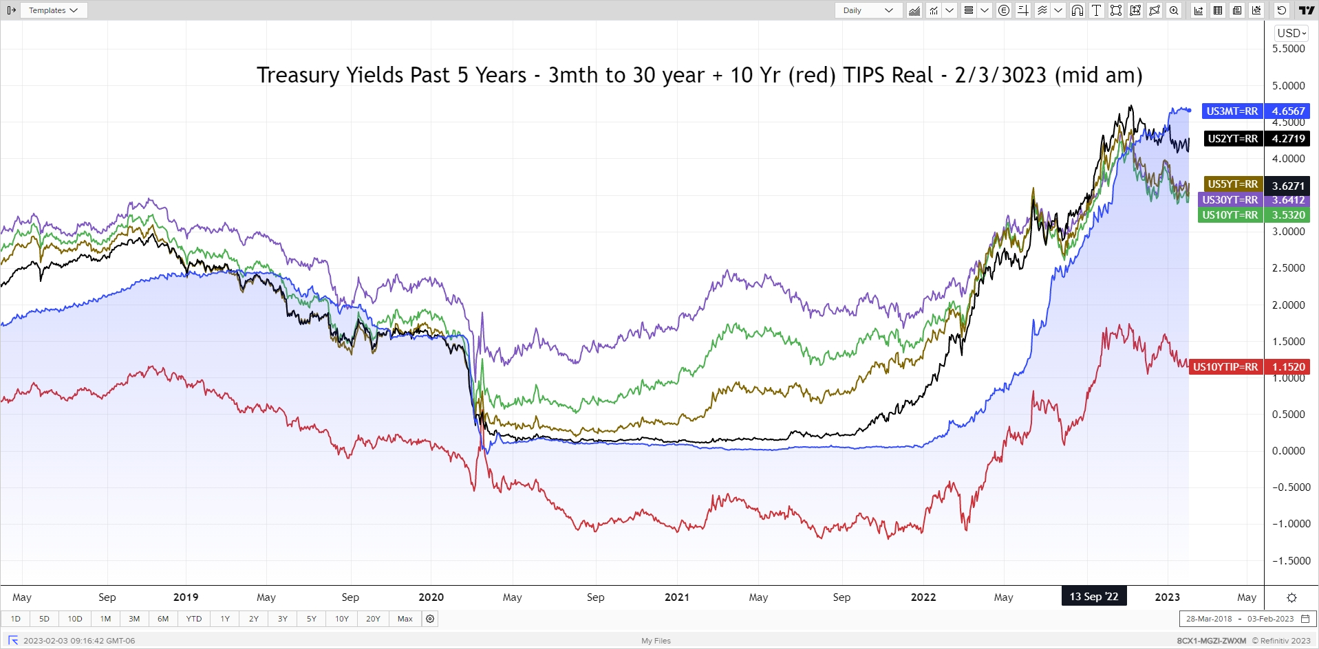 The FOMC meeting concluded its meeting on February 1st.  Recall that 2022 ended with the Fed raising rates by 0.75% four times in a row, then 0.50% at the December meeting.  This time they raised Fed Funds rate by 0.25% to a target range of 4.50% to 4.75%.  As a public service announcement, HOME EQUITY LINES OF CREDIT also went up 0.25%.  As another public service, recall the Fed’s balance sheet also is running off at a pace of $60 billion/month of Treasuries and $35 billion/month of mortgage-backed securities.  I mentioned earlier the bond market is fighting the Fed.  Two quotes from Fed Chair Powell at the press conference following the FOMC meeting (as quoted by Nick Timiraos Thursday in a WSJ article) captures two key points in my mind.  I’m on Powell’s side.