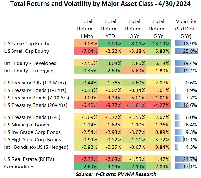 April was a down month for almost all asset classes. Similar to 2022, not only were equity markets down but also bonds – the longer the maturity the more painful. US Large caps continue to hang on to a +6.0% YTD return after this month’s 4% pullback. The same can’t be said of US Small caps; -7.0% downdraft in April brought YTD returns to -2.2%. International equities held up better, with Developed markets “only” down -2.5% while Emerging markets was positive for the month by +0.5%! Interest rates rose about 0.50% this month, leading to losses across all bond asset classes except T-Bills. Even high yield with tightening credit spreads couldn’t escape a loss this month. Jumping to the bottom of the table, you’ll see the biggest drop for the month belongs to REITs, down -7.3% for the month and a similar amount YTD. Commodities were the top performer of the month and a close second YTD, fueled recently by Gold and Cocoa.