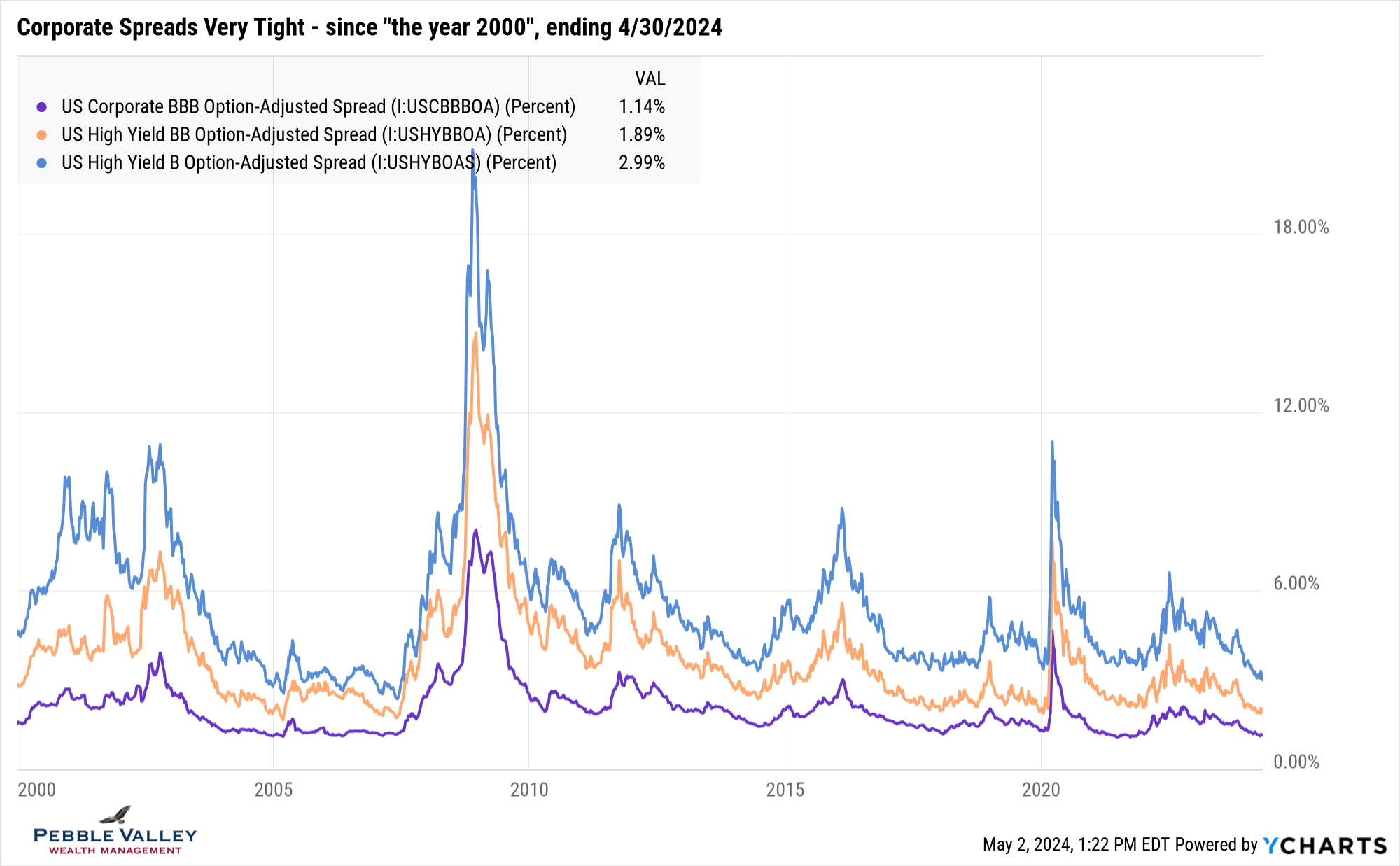 Below the Treasury Rate graph I show corporate credit spreads going back “to the year 2000” (any old-timer Conan fans?!). You can see spread levels – the extra yield paid to own bonds that may not return your money, unlike Treasuries – are very low historically. If the market demands more payment for those worried about being paid back, this will cause corporate bonds and bond funds to lose value, in addition to any treasury rate movements mentioned above. This graph provides a visual for the term “go up in quality” since not getting paid to take extra credit risk right now.