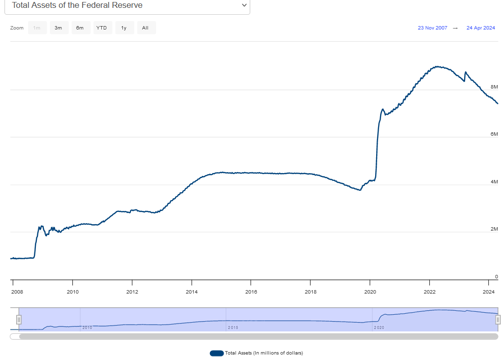 The FOMC concluded their latest meeting on May 1st. They held rates steady as expected. Focus was on whether Chair Powell would mention potential rate hikes given recent hotter inflation readings. He did not. He even said it is unlikely the next move is a hike. After the last GDP report, which saw lower (but positive) growth along with rising inflation, Powell also received a question about stagflation – anemic growth along with inflation. He put cold water on this also, pointing out that growth still remains and inflation, while higher than want, is below 4%. The other thing that got my attention was Powell stated a couple of times the Fed’s intent remains getting inflation down to 2%. There has been talk they may stop in the “mid- to high- 2’s” but clearly he disagrees. The CME Fedwatch Tool shows the implied probability of only ONE 0.25% rate cut by the end of 2024 has risen to just over 40%, well up from less than 5% in early March. Recall there were six to seven rate cuts priced in at beginning of the year.