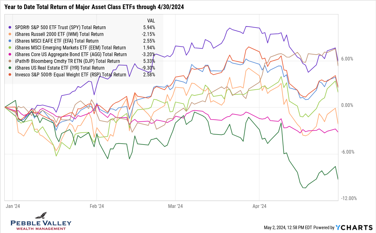The graph below remains the same with total returns of major asset class ETFs, including the equal-weighted S&P index ETF (ticker RSP). You can see all asset class ETFs were down for the month of April except for the brown line representing commodities. The green line that fell out of bed are the REITs. It is interesting to note the magenta line representing US bonds – “the AGG” – has been negative for almost all of 2024 and is the second worst performer YTD. The Growth v. Value dispersion which dominated 2023 returns is not present so far this year, though a slight nod to better performance for Growth.