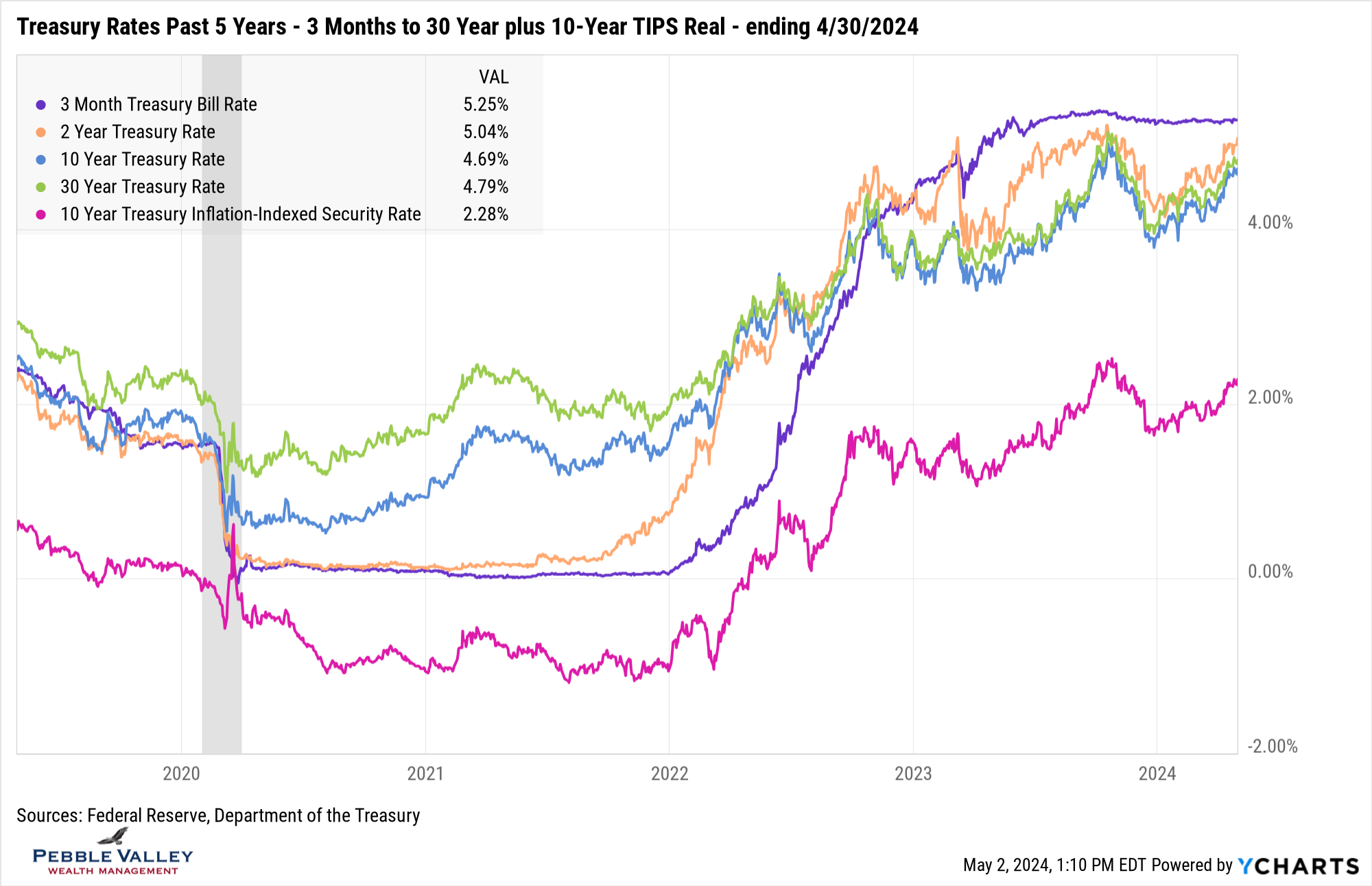 Looking at the Treasury Rates chart below you will see rate levels are close to the relative peak levels seen last fall. 3-month TBills are holding at similar levels while the Fed remains on hold. Much of the bond price action in 2024 (and resulting yield moves in opposite direction) is tied to inflation remaining sticky or even creeping back up after falling last year. This has a direct impact on market expectations of Fed rate cuts, which is very tightly linked to 3-month and 2-year rate moves and influences longer maturity rates. Even the TIPS real yield – fixed coupon received IN ADDITION to actual inflation – resumed the march higher. More on that with I-Bonds in my special topic below.