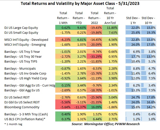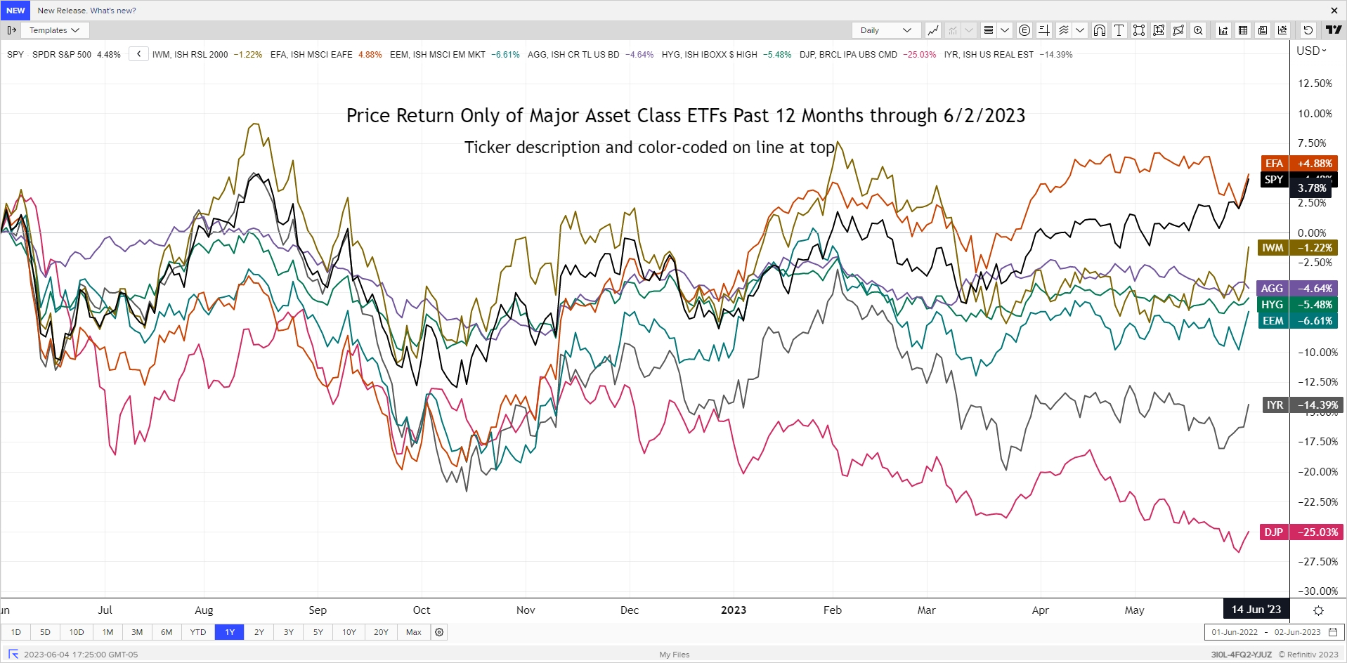 The graph below shows price return only of major asset class ETFs. Note this graph covers the past 12 months so different return for SPY and IWM from the first graph. Also note this includes data through 6/2/23 so it reflects the sharp rally after the jobs report and debt ceiling resolution. The recent outperformance of Int’l equity reversed and now the past 12-month price returns are similar to US Large Caps. The US Dollar strengthened in May which reduces international returns after converting to US$ terms. Commodities continue to lag, both from potential recession concerns but also depleting stockpiles according to Goldman Sachs commodity strategist. There is an OPEC+ meeting in early June that may reverse the trend.