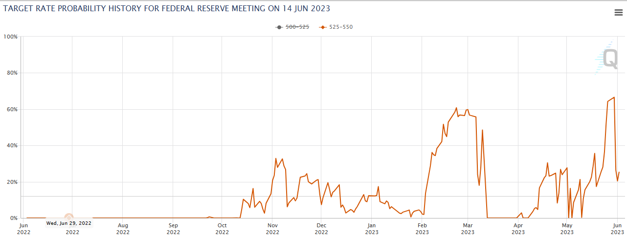 The next Fed meeting concludes June 14th. In addition to the usual statement and press conference, this meeting also provides the Fed’s “Summary of Economic Projections” on GDP, unemployment, inflation and Fed Funds rates (the dot plot). The current Fed Funds target range is 5.00% to 5.25%. For most of May the market expected the Fed to pause at this upcoming meeting. But the Fed’s preferred inflation gauge – Personal Consumer Expenditures – ran hotter than expected on May 26th. Fed Funds futures began pricing in over a 60% probability of a 0.25% hike. This was abruptly “talked out of the market” by a couple Fed speakers indicating it may be prudent to pause this meeting and allow previous cuts to work through the system before possibly raising later if necessary. “Skip” was the word tossed around. The graph below shows the implied probability of raising rates by 0.25% at the next meeting. You can see the spike up on May 26th followed by the walk-back – though still hovering over 20% probability. It will be an interesting meeting coming up. (Source: CME FedWatch Tool).