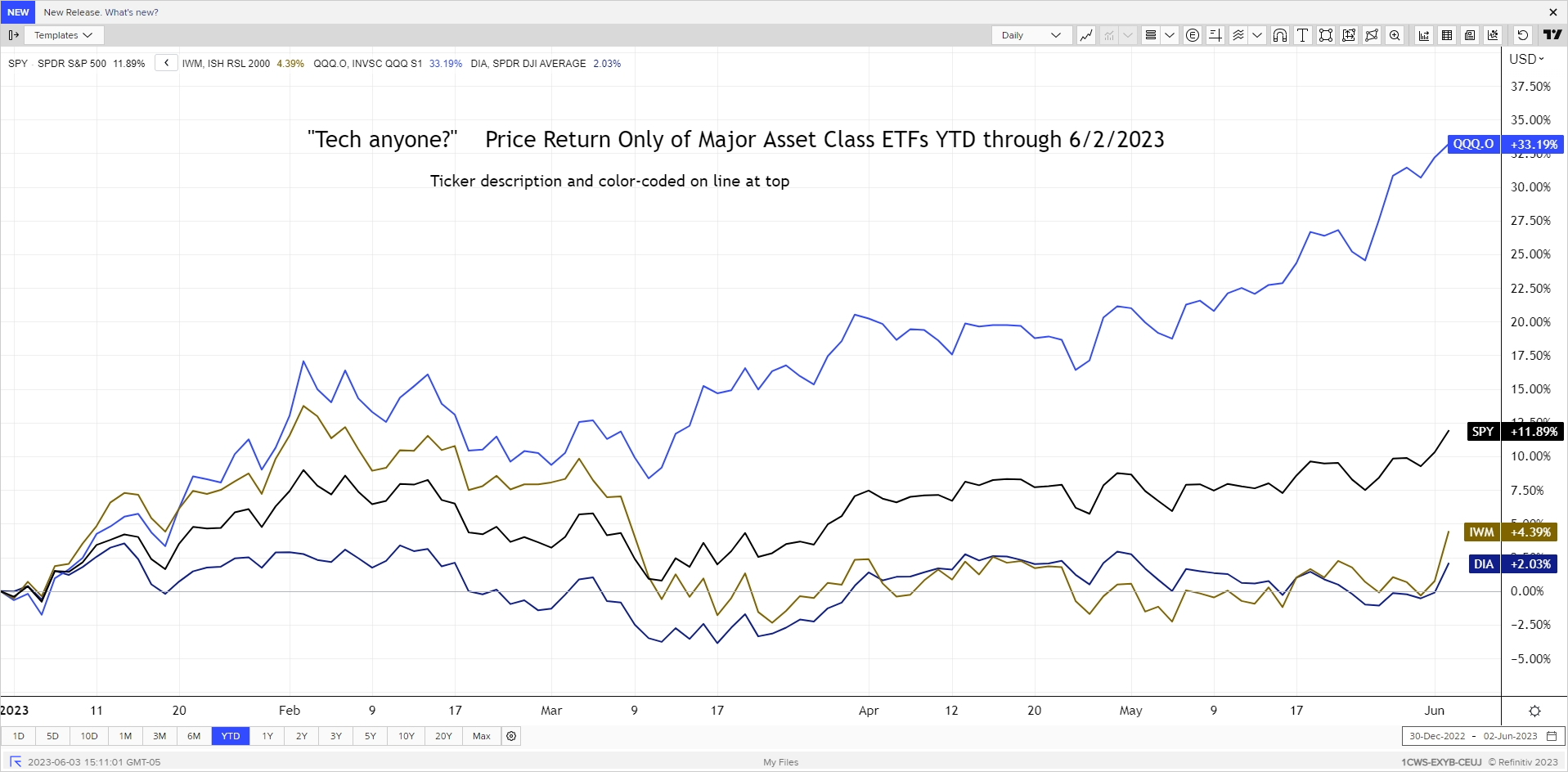 The “1 Month” column in the table above has an interesting mix of returns this month. Starting with bonds, they were down slightly for the month across maturities and underlying credit (Muni, Corp, High Yield). But if you glance to the bottom of the table, you will see the newest addition to bond asset classes for some – CASH – returning 0.40% for the month – or 4.9% if annualized! Commodities got crushed on lower energy returns (though watch the OPEC+ meeting this weekend). On the equity side, there is close to a 5% range in monthly returns as US large caps continue to lead the charge. Surprisingly, the laggard for the month had the highest YTD return last month - international developed markets. US small caps and international emerging continue to meander together. If one drilled into two US large cap indices, you would even find close to an 11% range in returns. In May the tech-heavy NASDAQ (QQQ) returned 7.7% while Dow Jones Industrial Average (DIA) was down -3.2%. The graph below shows this range on a YTD basis, along with S&P500 (SPY) and Russell 2000 (IWM). If you added a “growth ETF” it would track the Nasdaq and a “value ETF” would track the Dow Jones Industrial Average. That will explain most performance divergence across investors.