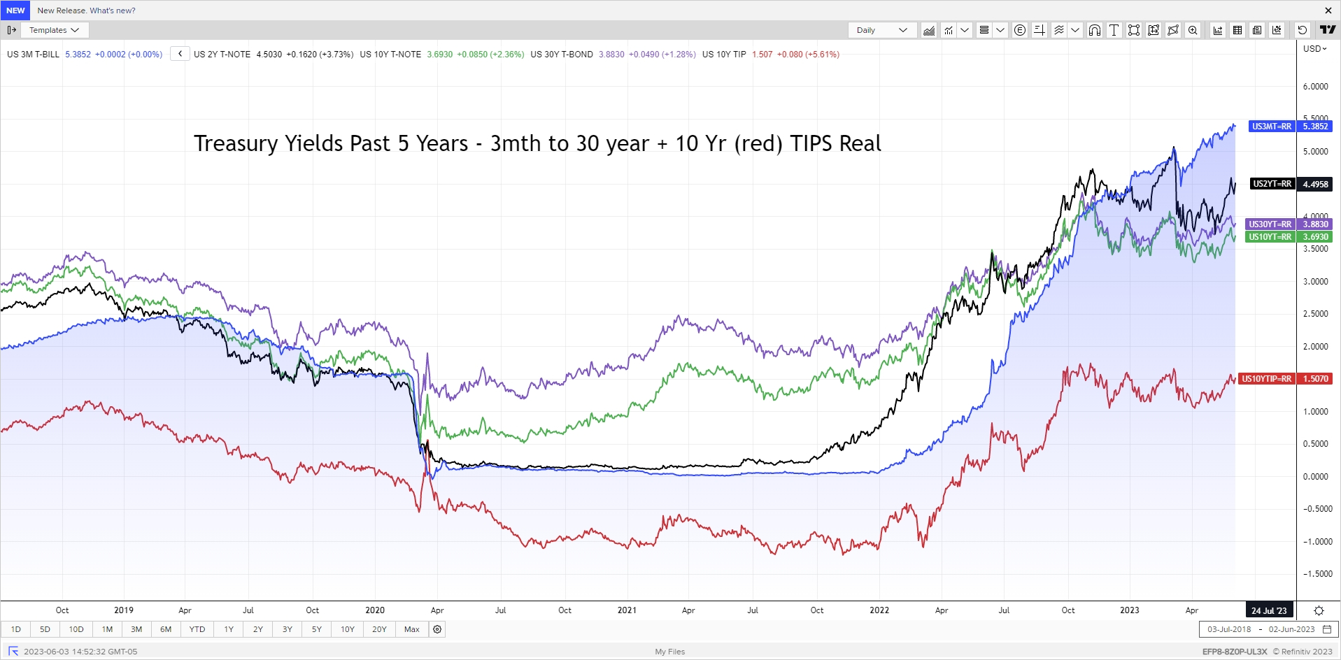 The usual Rates graph shows the continued march higher, especially at the shorter-end. The 2-year treasury rate is back to 4.5% after collapsing mid-March around the banking issues. The 3-month treasury bill remains at the top of the rate mountain at close to 5.4%. The crazy moves around the 1-month T-Bill have settled down after the debt ceiling issue has been resolved though watch the extremely large Treasury Bill issuance next week following the debt ceiling resolution. The 10- and 30-year rates still seem too low to me but the market is pricing in a successful inflation-fighting campaign and lower rates after a recession hits. We don’t talk about the real yields of TIPS often, but a 10-year real yield in the 1.50% range appears attractive (red line).