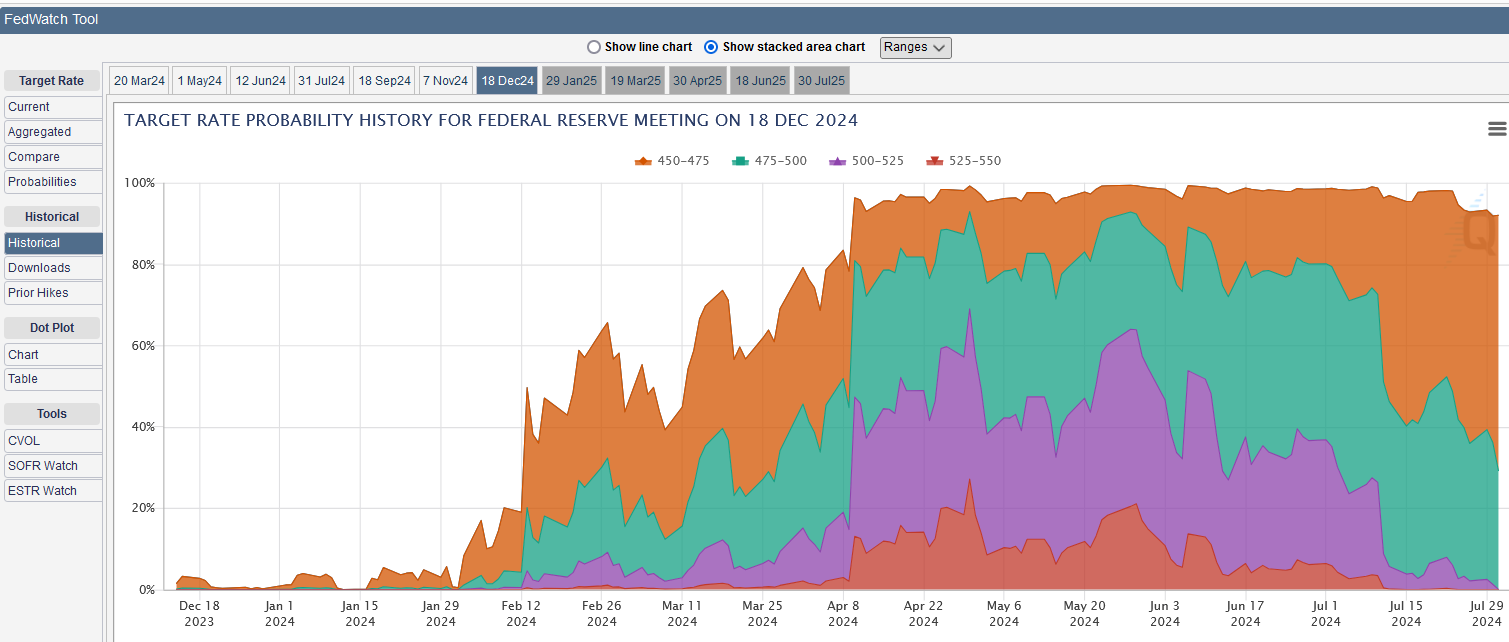 The latest FOMC meeting concluded July 31st. Rates were kept the same but the Fed statement included language discussing not just inflation that now only remains “somewhat elevated” but also referencing the slower jobs market, acknowledging “the unemployment rate has moved up but remains low.” The “somewhat” on inflation and “but remains low” on unemployment tells me while the Fed is moving toward the first rate cut, the data will need to reinforce over the next couple months to make it happen at the September FOMC meeting. What does the market think about rate cuts? As the kids would say, LFG! The CME Fedwatch Tool graph shows the market is currently pricing in an extremely high chance of three rate cuts by year-end. Note this can change as data changes. Recall the big change in sentiment last spring as the market began pricing out the 6-7 rate cuts that were priced in late last year.