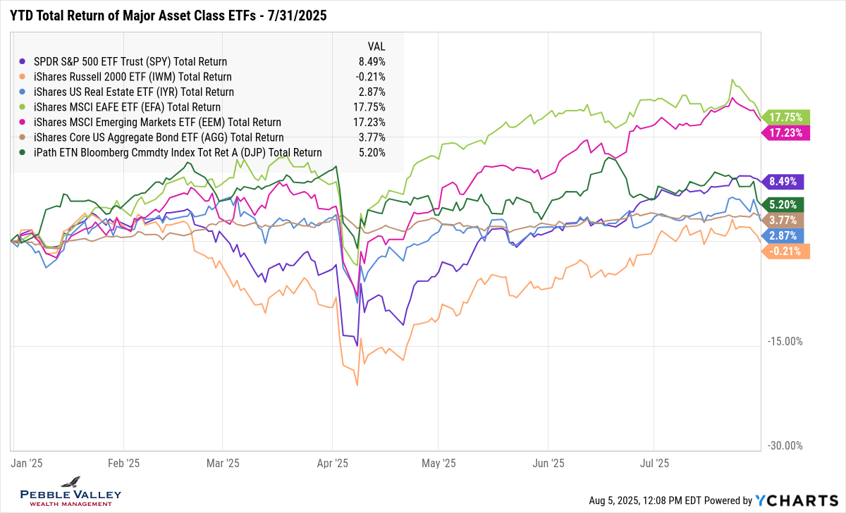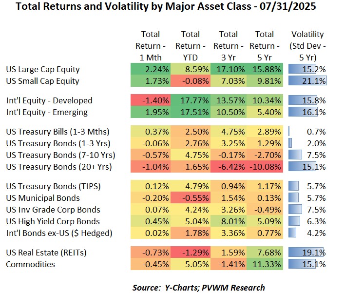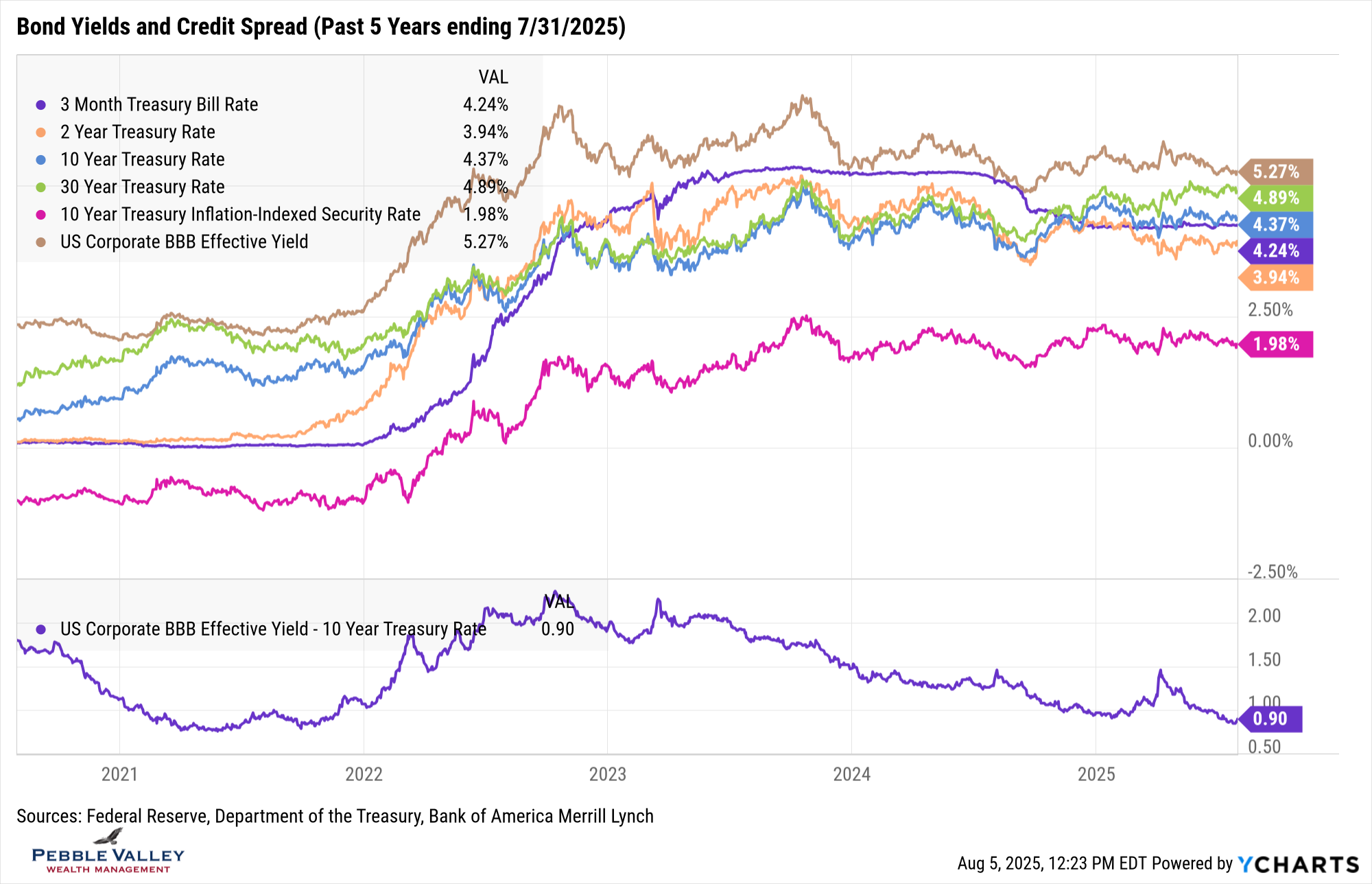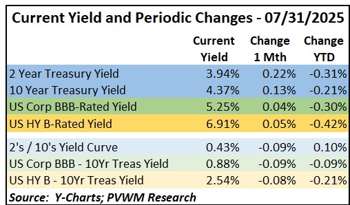 Yields rose for the month, with the 10-year Treasury up 13bps while the 2-year was up 22bps.  Rates were up even higher mid-month before retreating.  Note the graph data stops on 7/31/2025.  I mention this because after the weaker jobs reports released on 8/1 (sizeable previous months’ revisions) the 2-year treasury yield is now about about 50bps below 3-month TBills vs. the 30bps you see below. The 10-year also fell, but only about 15bps.  The long-end (30-year) yield remains stubbornly high.  This month I also included the BBB credit spread at the bottom of the yield graph.  The extra yield paid to take on credit risk continues to shrink as the market is paying investors less and less for taking on credit risk.  High demand for bond investments and low expectations for a recession continue to keep that spread tight – for now.  I still like staying up in quality and diversifying into non-credit investments.