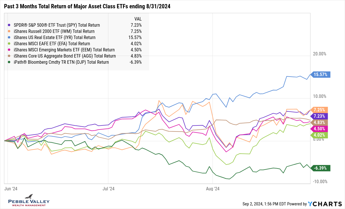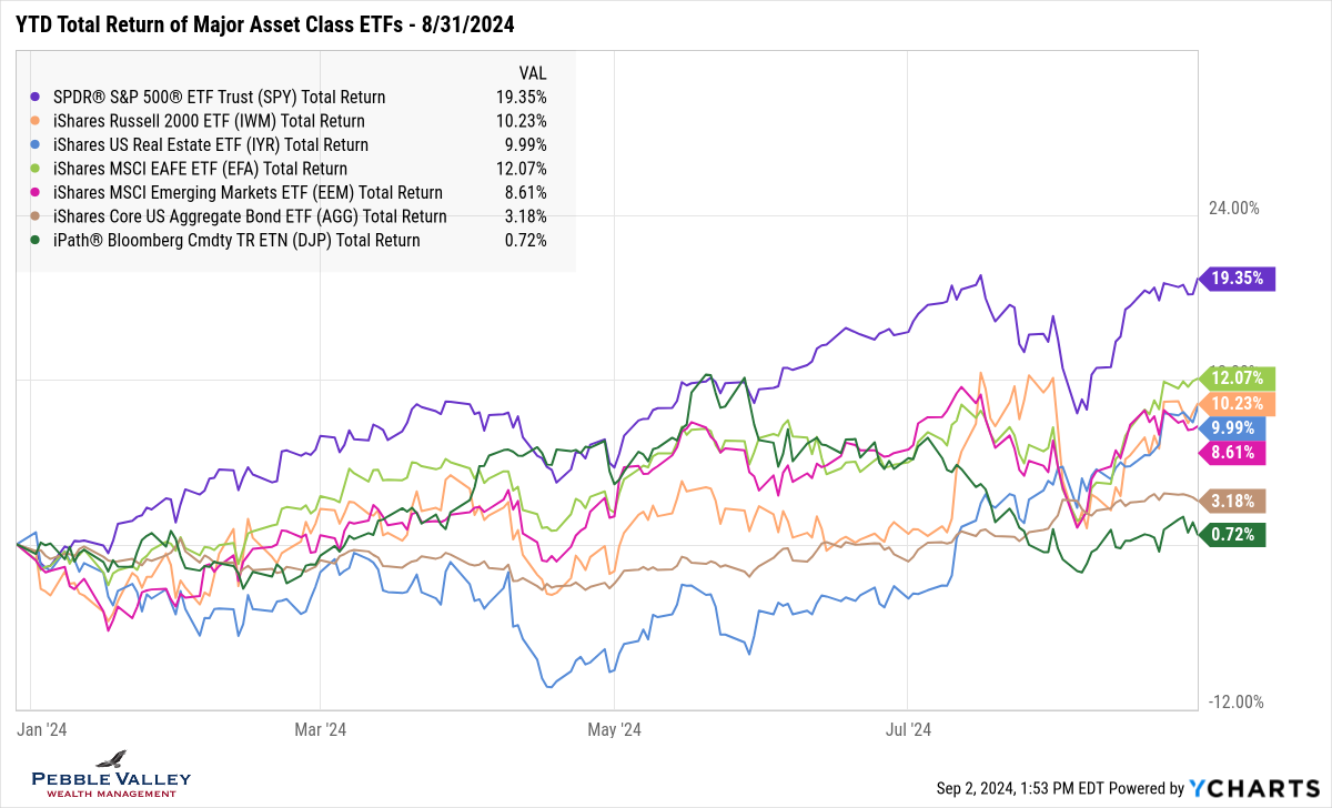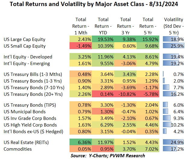 The first few days of August were choppy to say the least. After a weaker than expected jobs report on August 2nd (based on unemployment rate at least) and the combination of the US Federal Reserve leaning toward a rate cut in September while the Japanese Central Bank raised rates on July 31st, there was a significant pullback in risky asset classes leading up to and a few days following August 5. The volatility gauge (as measured by VIX) also popped substantially that day as various trades were unwound that relied on (or at least influenced by) borrowing funds in Japanese denominated currency (aka – the “Yen carry trade”). However, looking at the table above you would think it was a pretty tame month, with markets up slightly (save for US Small Caps) during a quiet month of August. If only…