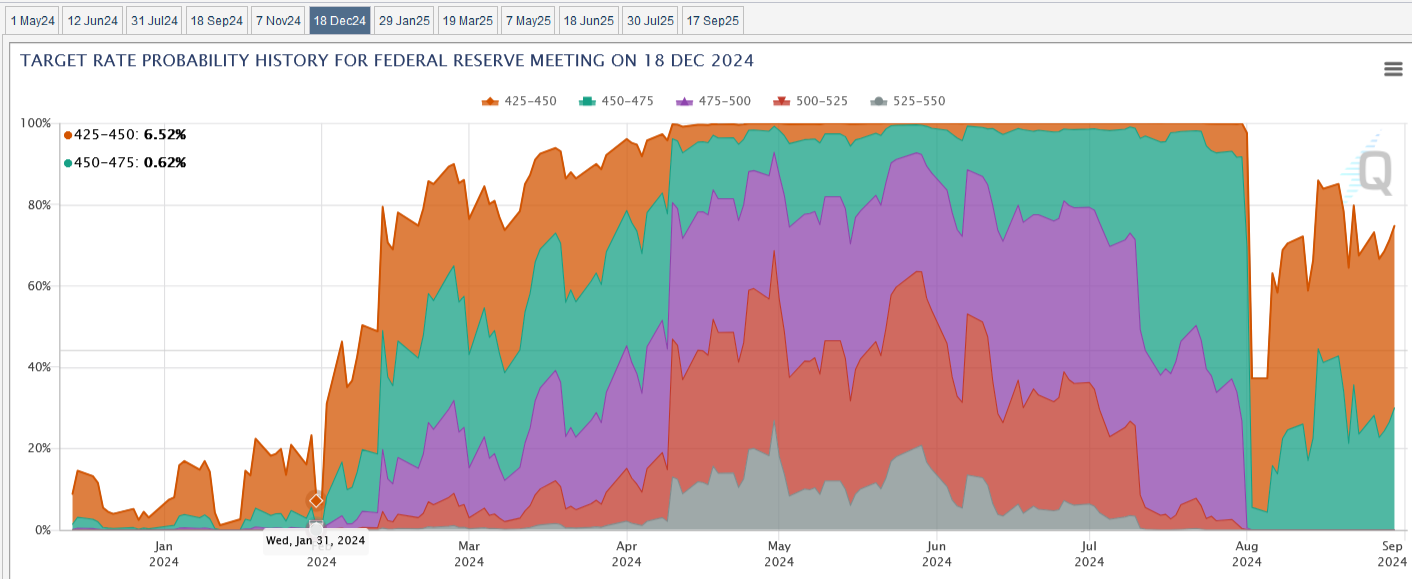 There was not an FOMC meeting during August but the Fed Governors gathered at the Jackson Hole Economic Symposium late in the month. Fed Chair Powell spoke on August 23 and stated “My confidence has grown that inflation is on a sustainable path back to 2%,…” all but assuring a rate cut at the next FOMC meeting that concludes September 18. “The direction of travel is clear, and the timing and pace of rate cuts will depend on incoming data, the evolving outlook, and the balance of risks,…” also assuring that the size and path is still uncertain. Note the Fed will also release their Summary of Economic Projections at this meeting. Let’s go to the CME Fedwatch Tool to see what the markets think will happen by the last meeting in December. First note the huge drop in expected rate cuts in early August in reaction to the “risk-off” discussed above. It didn’t take long to remove that overreaction in the Fed Funds market and now the most likely rate cuts priced in is 1.00%. With only three meetings left this year, that implies one meeting would have a 0.50% cut – again based on Fed Funds futures pricing. The next key catalyst to watch will be the Jobs Report this Friday.