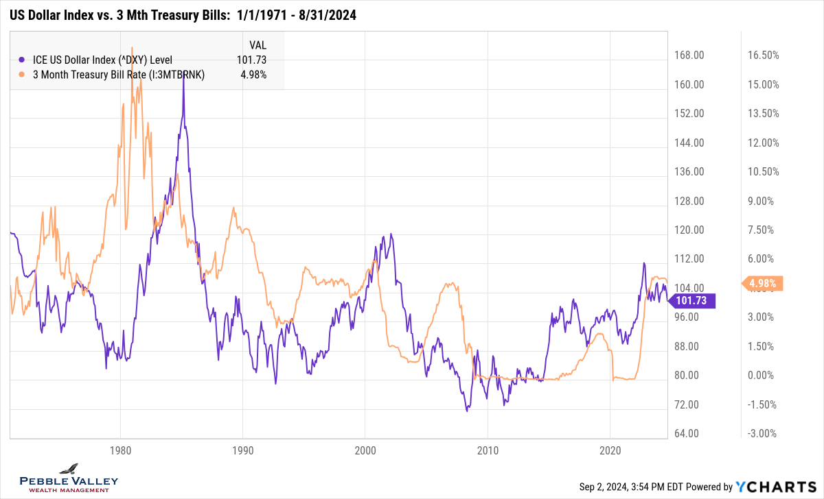 The special topic this month is the dollar index. The value of the US Dollar is driven by many factors and it is important to note the value of the US Dollar must be expressed relative to another currency. There was much attention paid specifically to the Japanese Yen to US Dollar early this month. One key driver of currency values is the relative short-term interest rate between the two currencies. If a given country has high short-term rates, all else being equal, an investor may want to be long that currency and short (i.e. borrow) a currency with low interest rates that is not expected to go up. The graph below shows the US Dollar Index back to 1971 along with 3-Month Treasury Bill yield. The index is made up of six foreign currencies – the Euro (EUR), Japanese yen (JPY), Canadian dollar (CAD), British pound (GBP), Swedish krona (SEK), and Swiss franc (CHF). As stated, there are many drivers to currency valuation, but two things to note: