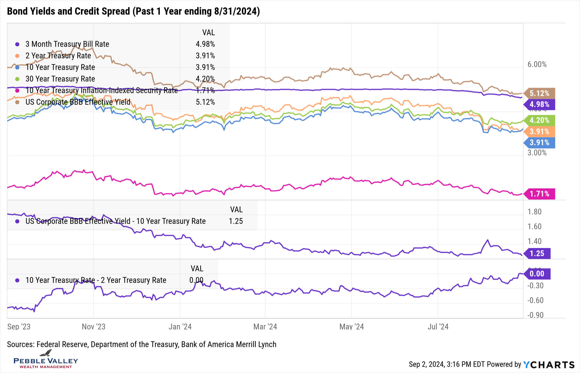 This month I am showing the bond yield graph over the past 12 months so you can see the related moves from early August in context with the “tight spreads” environment we are in. Credit spreads (BBB-rated) widened about 0.20% in early August while B-rated (mid high-yield bonds; not shown) widened about 0.35%, but both bounced back quickly. Using this shorter time period, you can also see the slight drift up in rates on the long-end (10- and 30-year maturities) as recent data shows a still relatively resilient economy The 2s/10s spread curve is now basically flat. Recall as the curve comes out of inversion, that can be an indicator of upcoming growth concerns as the Fed begins to cut rates.