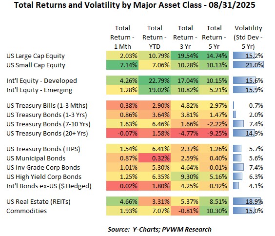 It was an overall solid month of returns for August – except for long Treasuries again. However, looking at the asset class details relative to July, it was mostly in “opposite land”: