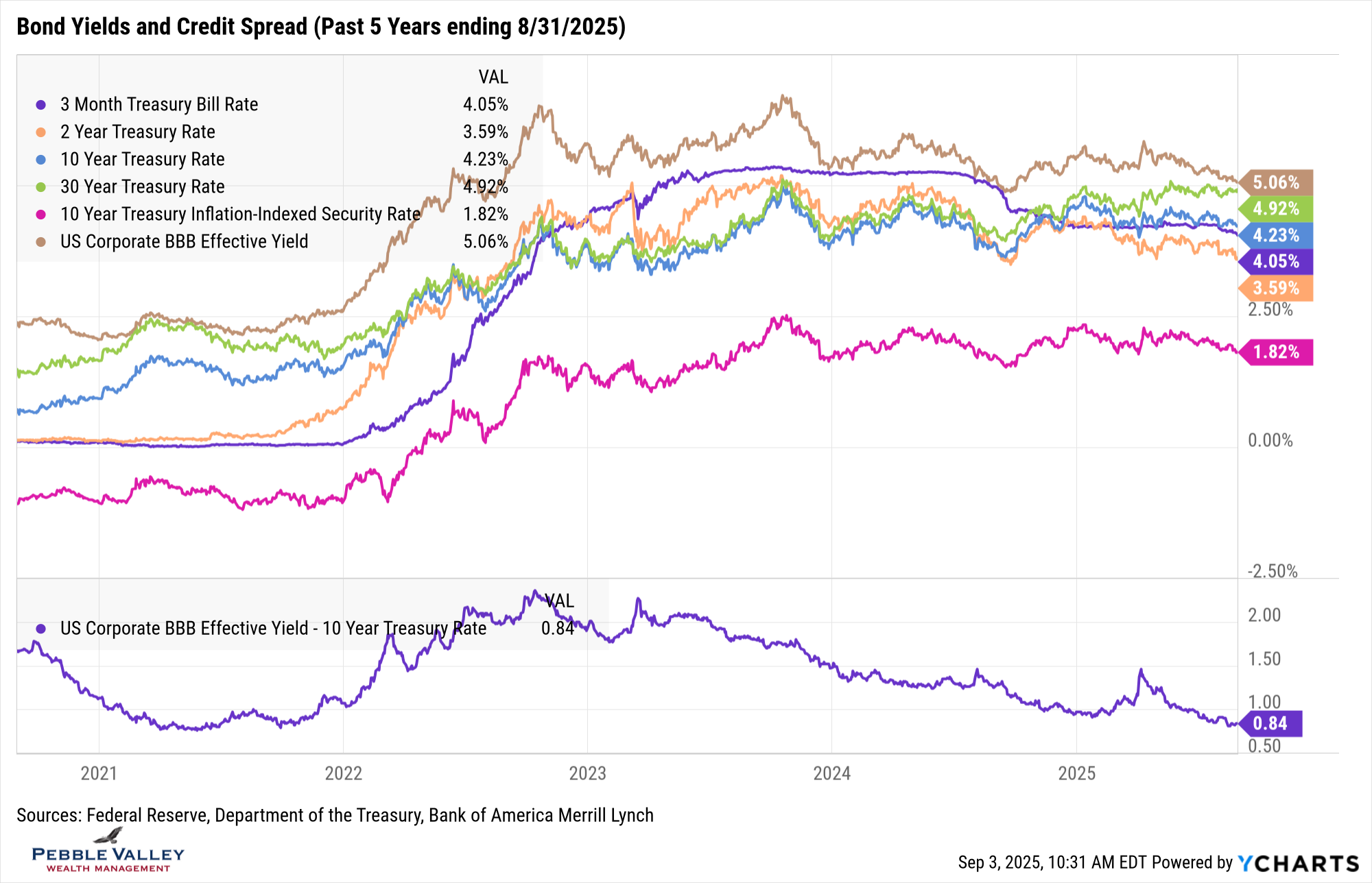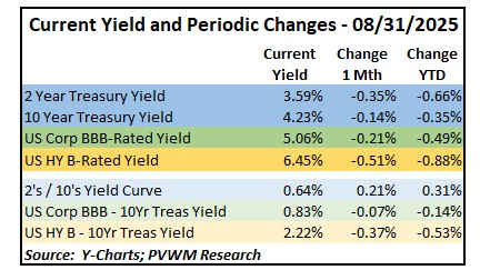 The main Fed news this month was the Jackson Hole Economic Symposium in late August. Fed Chair Powell gave a speech and opened the door for a rate hike at the Sep 17th FOMC meeting with the following line: “With policy in restrictive territory, the baseline outlook and the shifting balance of risks may warrant adjusting our policy stance”. Equity markets rallied and rates fell on back of the speech. However, there is the August jobs and CPI report, along with annual labor statistics revisions ahead of us before the meeting. However, in my view it would take pretty solid jobs data to lead the Fed not to cut rates in September given the “policy in restrictive territory” comment. Fed Funds futures agree, with the CME FedWatch tool showing the market is pricing in a 92% chance of a cut (as of 9/3 am).