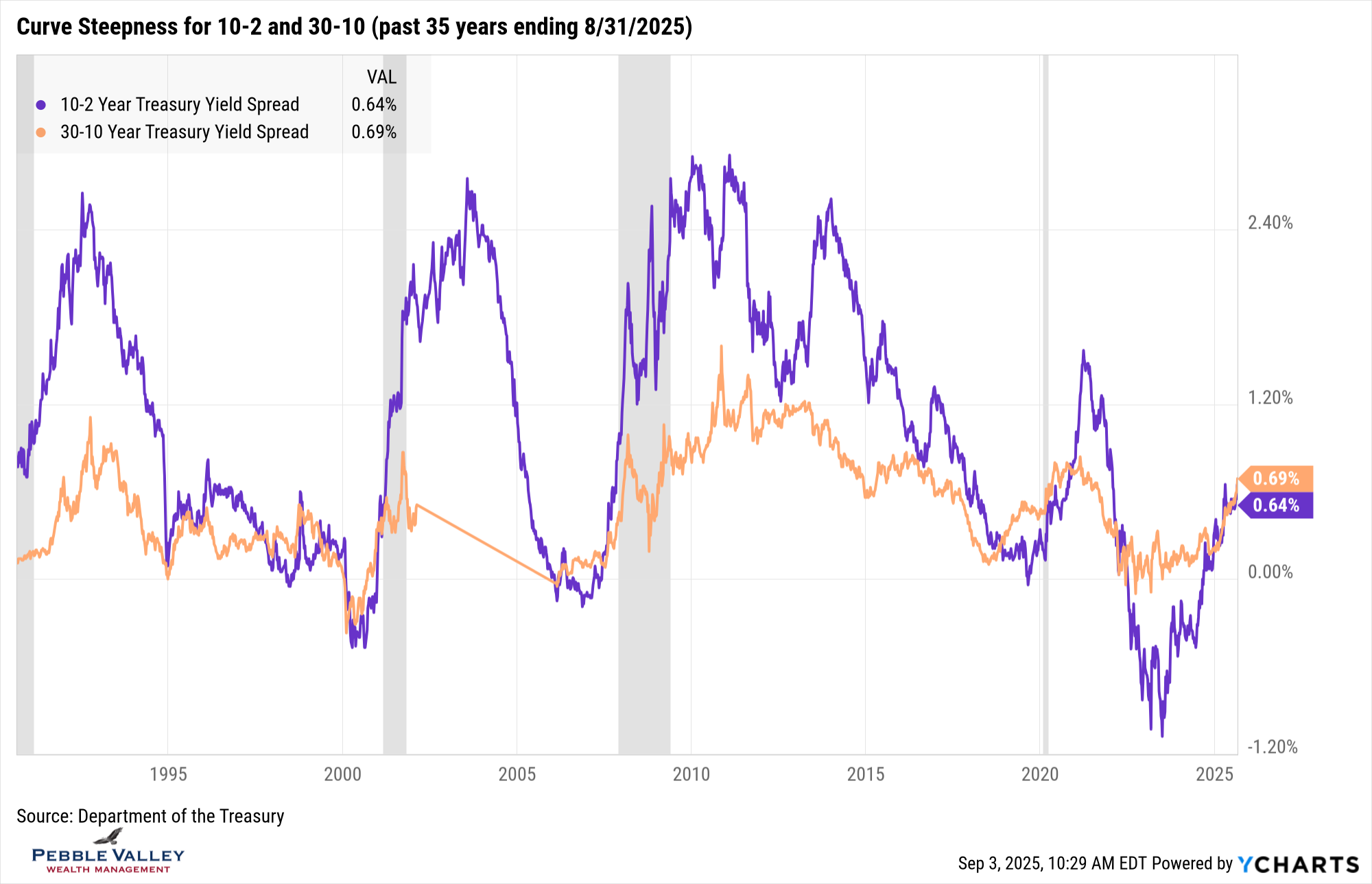 The usual yield graph for the past five years shows yields drifting lower (except the 30-yr), credits spreads getting tighter, and BBB corporate yield (just under 10yr avg maturity) getting very close to 30-year treasury yields as the market prices in credit risk and duration risk differently. Yields fell for the month – a lot for the 2-year, dropping 35bps (though recall was up 22bps in July). 10-year rates also fell, but only by 14bps, leading to what is called a steepening of the curve by 21bps. It is true the Fed will likely cut rates this month (see below) but note the Fed controls the very short-maturity rates. Longer-term rates like 10- and 30-year, while influenced by the short-term rates, also reflect inflation expectations, supply/demand dynamics and relative comparison to global rates. In addition to the usual rate graph, I include a curve steepness graph for 10-yr minus 2-yr and 30-yr minus 10-yr rates going back 35 years. A steeper curve (i.e. long rates noticeably higher than short rates) relative to what we’ve experienced the past few years is quite likely.