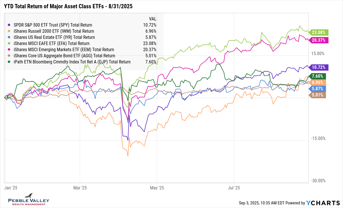 The graph below shows YTD total returns of major asset class ETFs. All lines in the graph continue to move up. One line that really moved up is the previously mentioned US Small Caps as it landed with the rest of indices on solid positive YTD territory. At the factor level (not shown), Value and Dividend payers outperformed Growth and Momentum in August – continuing with the “opposite land” theme.