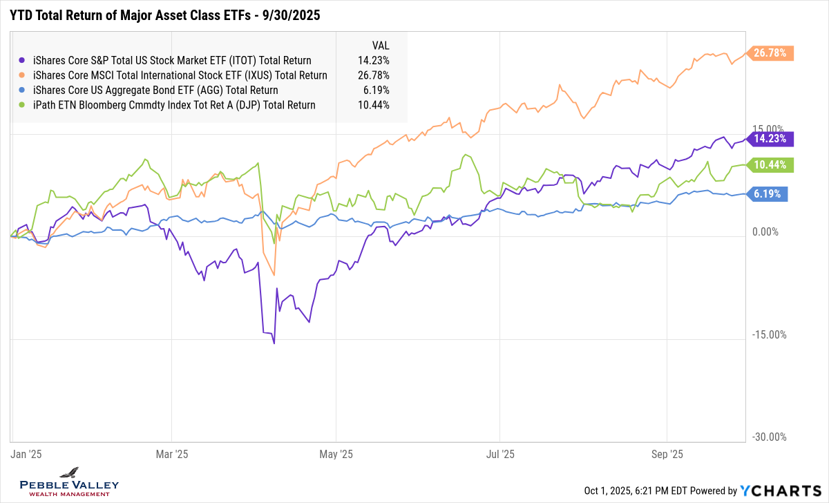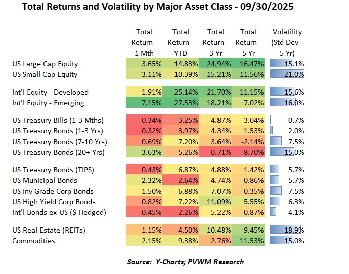 Historically September can be a weaker month in the markets (and October also!) but not this year.  Looking at the table above you will see all positive returns for the month.  In fact, the only negatives on the entire table are from 3- and 5-yr annualized returns from long-dated Treasuries as the large losses from 2022 and 2023 still haven’t been recovered.  And notice the annualized 5-yr returns for International equities have benefited from the current strong year.  A few other things to note from this year: