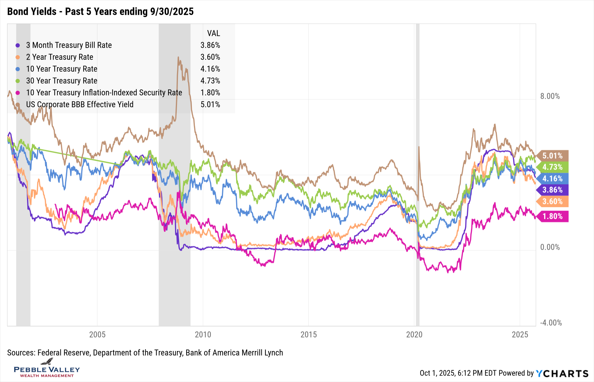 The bond yield graph for the past five years show yields staying bunched together recently, though the 10- and 30-year along with the BBB corporate yield continue to grind lower.  If you squint – or just look at the #’s in the legend – you can see the BBB spread is now just 0.85% off the 10-year Treasury.  Despite the FOMC cutting rates, the 2-year rate was up 0.01% for the month, demonstrating that it is not always what happens in the market on a given day that drives prices, but rather how it differed from market expectations. I haven’t mentioned that magenta line (10-year TIPS real yield) in awhile.  It continues to hold or drift lower recently.  As a friendly reminder, if you like a fixed 1.10% real yield + actual inflation on super safe money and you haven’t added up to $10,000 to I Bonds in 2025 yet, be aware the rate resets on Nov 1.  Also note if you have older I Bonds you might be better off redeem and buy to step into a higher fixed rate.  My clients know what I’m talking about.