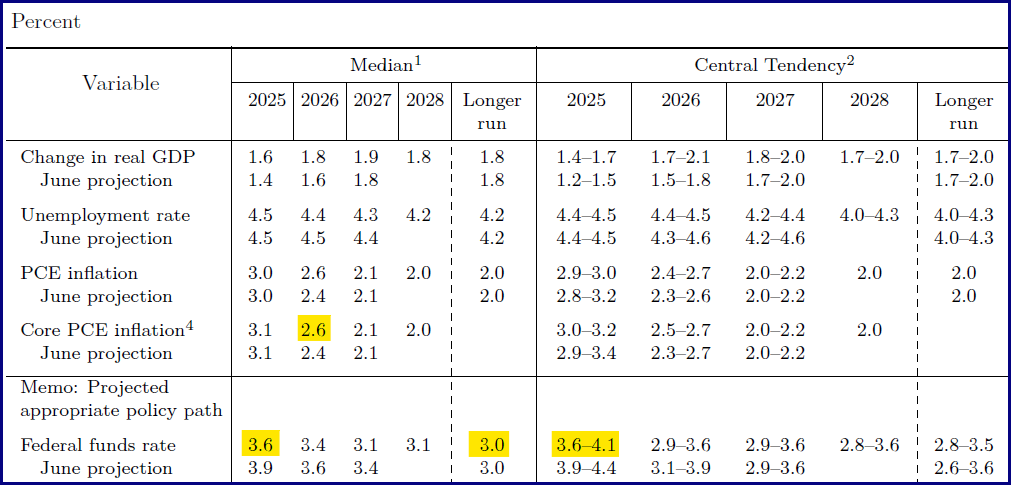 The latest FOMC meeting concluded on September 17th.  The Fed delivered a 0.25% rate cut and provided a quarterly update of economic guidance via the Summary of Economic Projections (SEP).  The statement that accompanied the meeting emphasized the slowing jobs market while acknowledging stubborn inflation.  Unlike the July statement, there was more of a lean toward the downside risks to employment.  This likely means a 0.25% at each of the next two meetings (Oct 29, Dec 10).  That was the median estimate from the SEP also (see below).  The Fed Funds futures market agrees, pricing in 90+% chance of a rate cut at each of these meetings (Source:  CME Fedwatch as of 10/1).