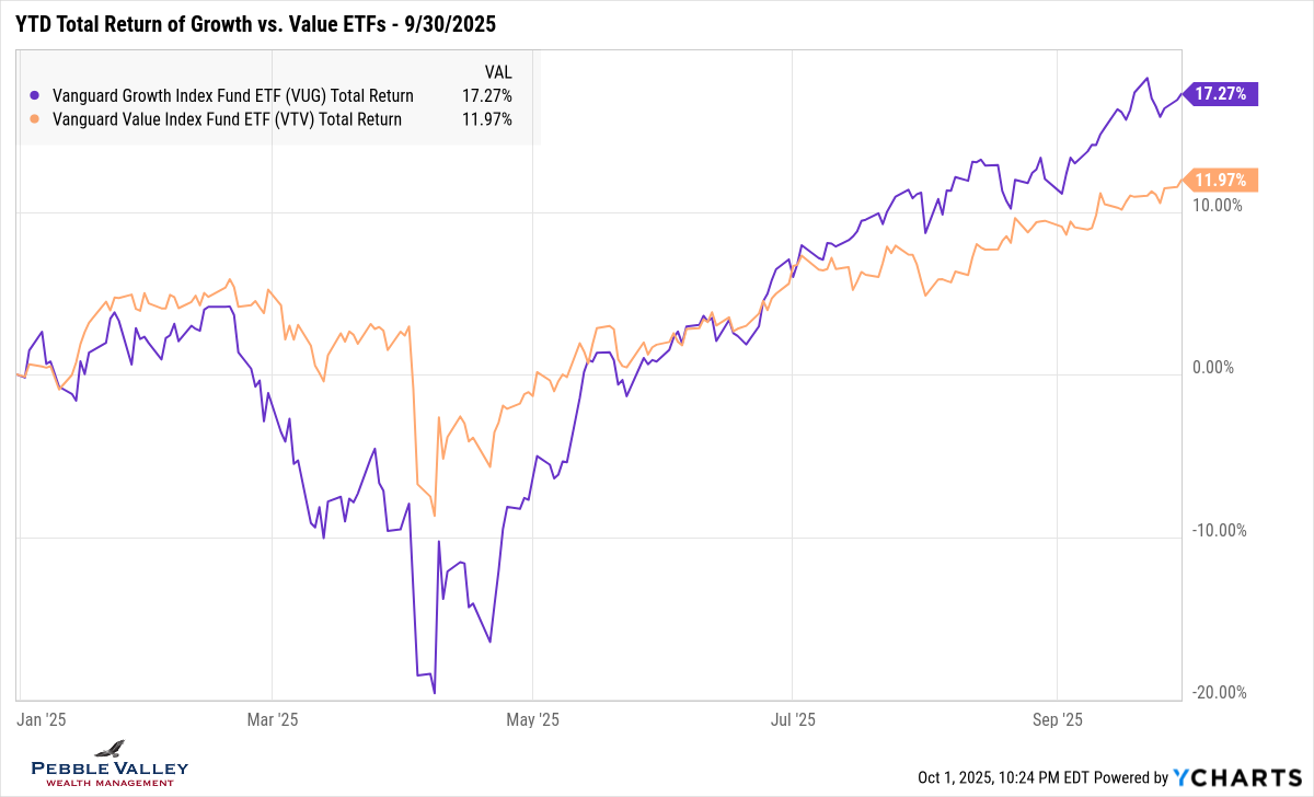 The graph below shows YTD total returns of major asset class ETFs.  Starting this month, to provide a cleaner view, I combined US equity large and small caps into a total US equity ETF as well as combining Int’l equity developed and emerging.  I also dropped the REITs.  You can refer to the table above if want added granularity.  The clean view shows very solid returns for nine months of work, especially in light of the -15% drawdown in early April for US equities. Bonds remain steady, clipping the coupon for the first half of the year but also picking up some price appreciation from lower rates recently.  The next graph shows Growth vs. Value.  After early year outperformance by Value and a 12% lower drawdown differential, Growth has steadily powered ahead, and picking up steam since early July.