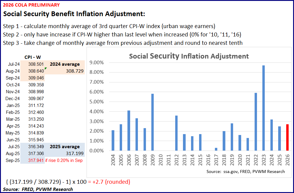 My special topic this month is an early estimate on the 2026 Social Security inflation adjustment.  Recall benefits are adjusted for inflation each year based on the average Q3 CPI values and take effect the following January.  The last CPI print needed for the calculation occurs Oct 15.  Using the first two months’ CPI values and assuming a small rise in September, the likely adjustment will be in the 2.6 – 2.8% range.  The increase for 2025 was 2.5%.