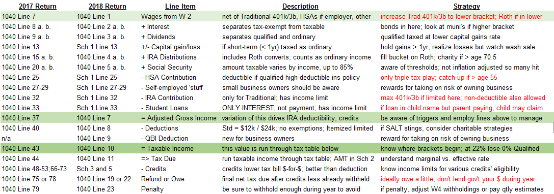 The table below references some of the key lines from your tax return. While fairly detailed, it is not intended to cover all tax details and shouldn’t be used as tax advice. For experienced tax filers, some of the lines may seem basic but this summary can also be used by those just entering the work force and have already met their new friend FICA. I highlighted in red those items that may interest them. Do them a favor and forward this post!