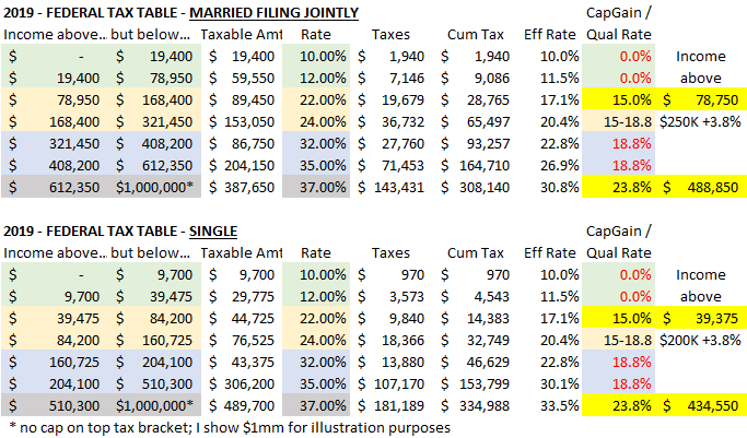 Here are the 2019 tax tables for tax planning this year. Note the capital gains and qualified dividend rate is 0% for the two lowest brackets. Also note the top capital gains rate kicks in at income levels BELOW the top income tax bracket (remnant of 2017 tax rules).