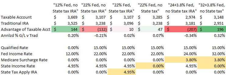 This analysis assumes current tax law doesn’t change.  If the difference between ending account values is small and you believe income tax rates may be higher in the future, then more scenarios will favor the taxable account.  For example, if IRA withdrawals became taxable at the state level (or you move to a state that does) the advantage switches over to the taxable account for someone in the 22% bracket (third scenario below).